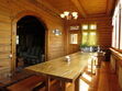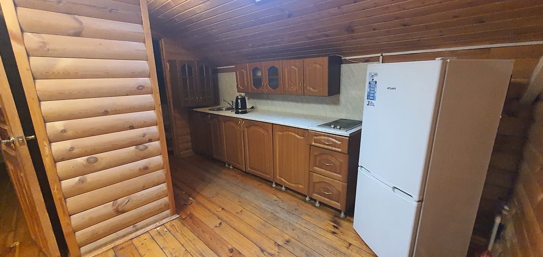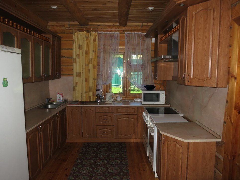 - обедня с кухонным столом, рассчитанным на всех гостей дома, с расположенными по всему периметру окнами с прекрасным видом на территорию базы отдыха и речку Клязьму;