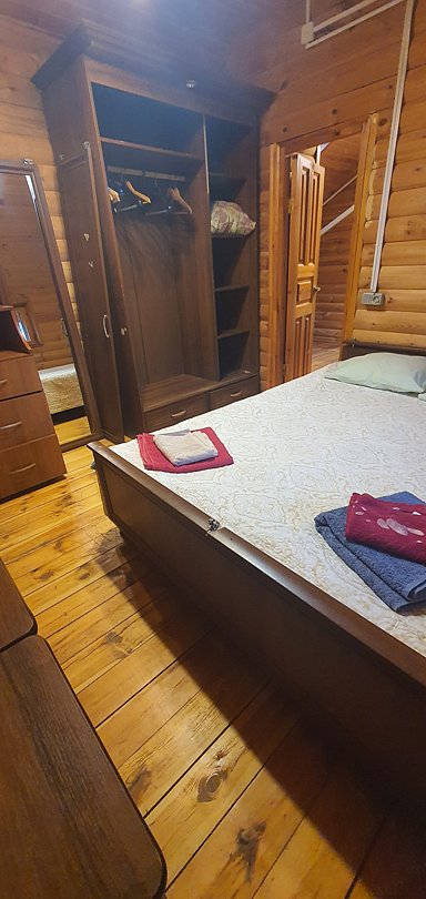 На этаже 2 комнаты с двуспальными кроватями и шкафами. В одной спальне люлька для ребёнка.