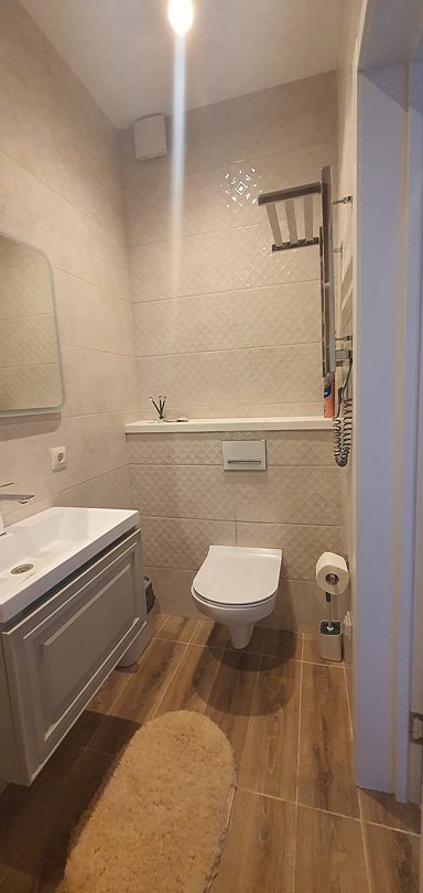 Душевая и санузел. Зеркало, полотенцесушитель, туалетные принадлежности.