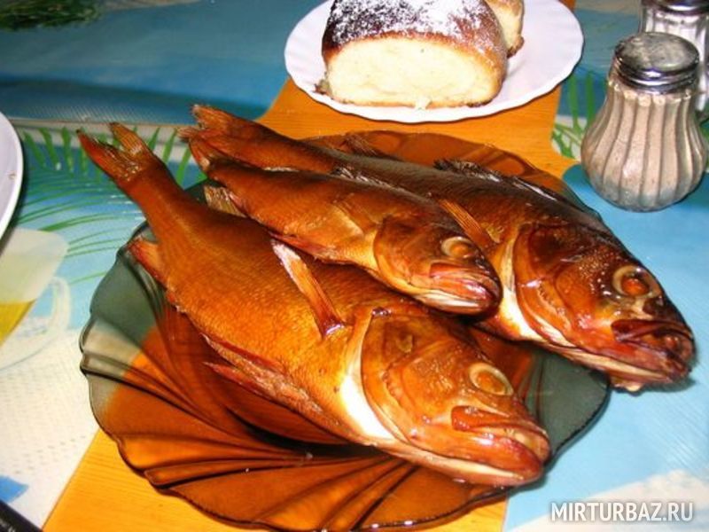 За дополнительную плату можно заказать шашлык, копченного угря и другую рыбу.