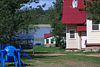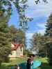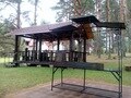 В теплое время года рядом с коттеджем своя зона отдыха : стол, стулья, садовые качели с видом на озеро.