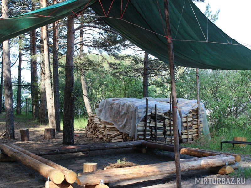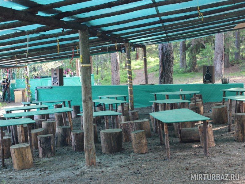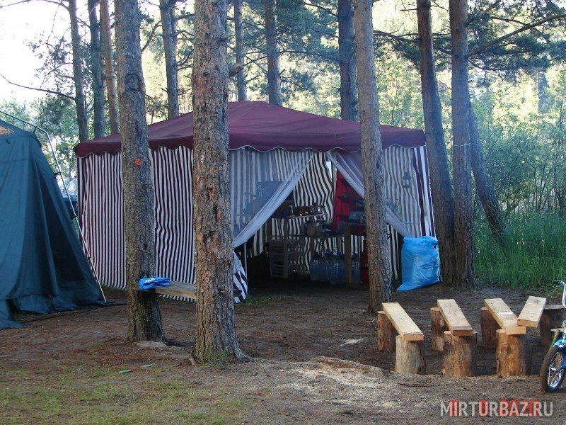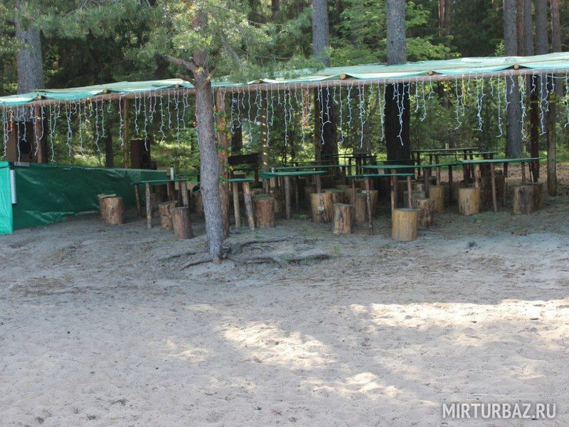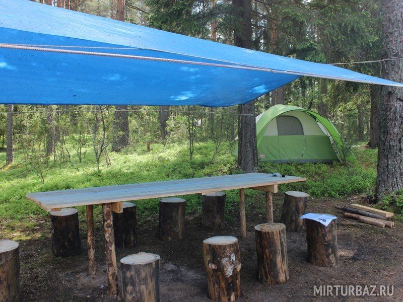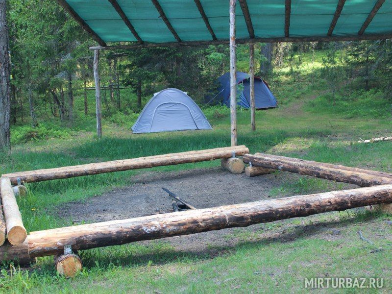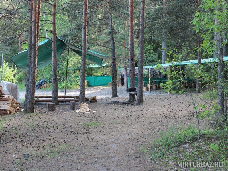 Комфортный лагерь с палатками обустроен прямо на берегу речки, а вокруг этой территории произрастает живописный сосновый лес.