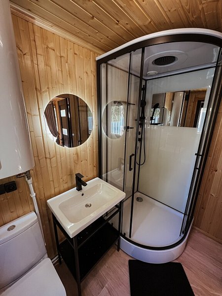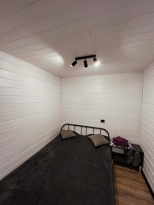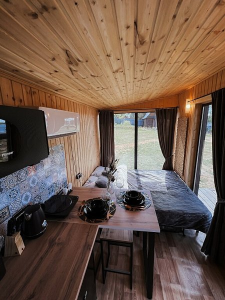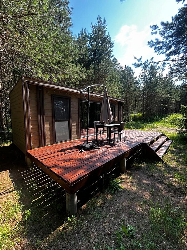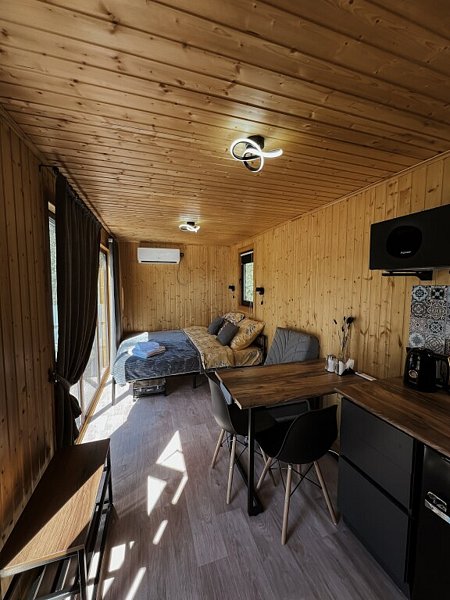 Домик рассчитан на 2х взрослых + дополнительное место (раскладушка комфортабельная). Дети до 3-х лет располагаются бесплатно на кровати родителей. Домик с собственной парковкой находится в уединенном месте, с видом на лес. Есть терраса с уличной мебелью, перед домиком есть мангал, мы предоставляем дрова. Решетку, уголь и розжиг можно приобрести отдельно.