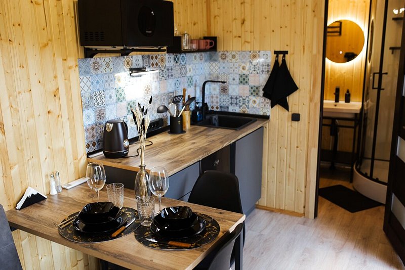 - мини-кухня с индукционной плитой, раковиной, чайником, микроволновкой, мини-холодильником с морозильной камерой, посудой для приготовления пищи;