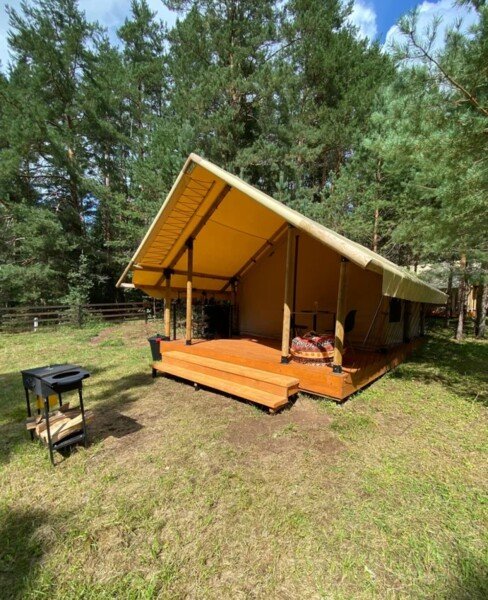 Территория глэмпинга разделена на 3 зоны: большой дом для компании до 15 человек, сафари-тенты для 2-3 человек и домики для 2-3 человек. У каждого варианта есть собственная терраса с уличной мебелью и мангальной зоной.