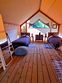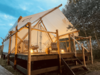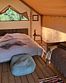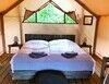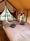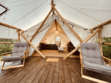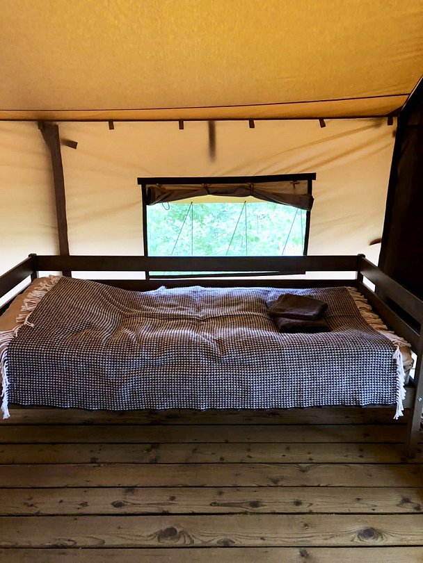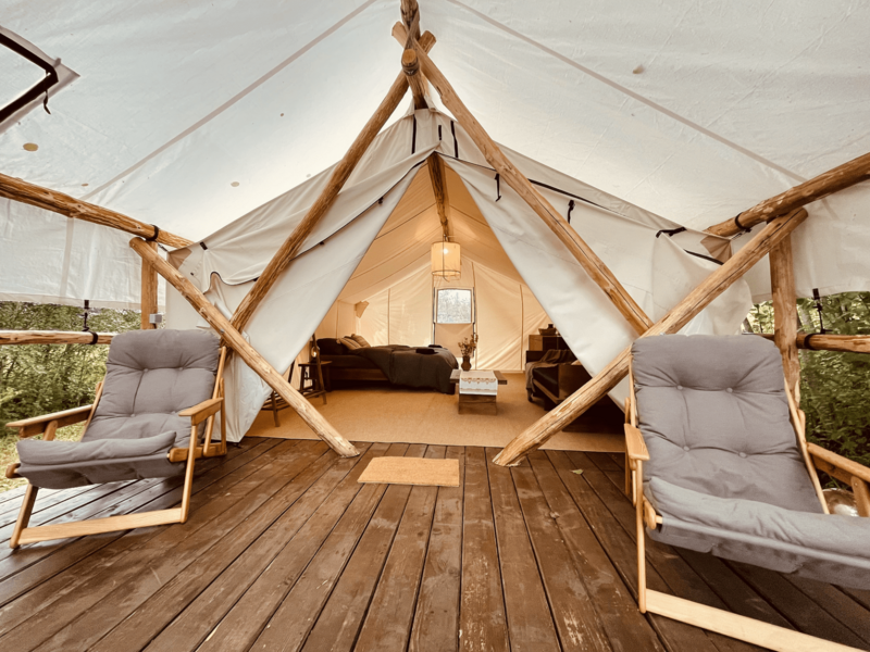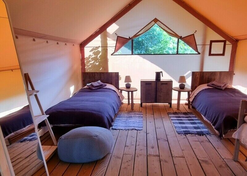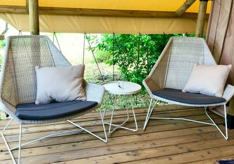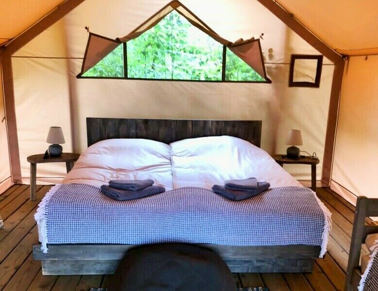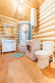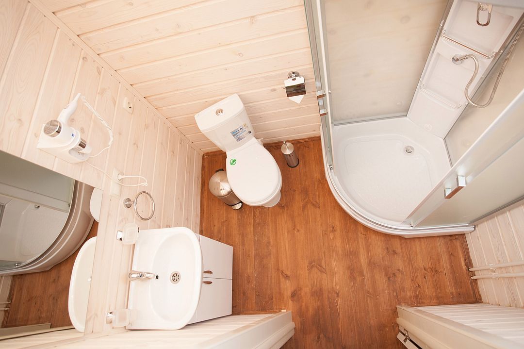 Во всех домах — деревянная мебель, выполненная их экологических материалов, есть мини-кухня, оборудованная необходимой посудой и техникой, камин, индивидуальный санузел. В глэмпингах же имеются удобные кровати, диван, есть терраса с плетенными креслами. Душевые и санузел общие, они распложены на территории.