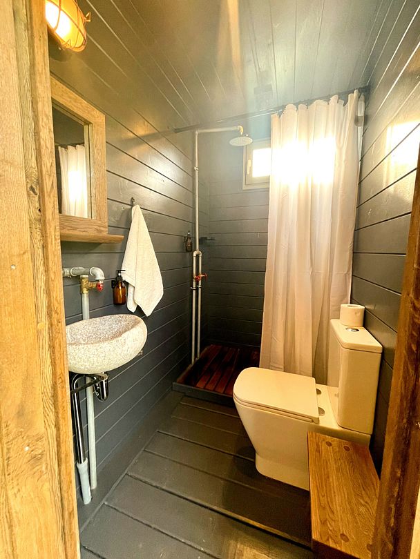 Кровать с подогревом, набор посуды и чайник,мини-холодильник, отдельный блок с душем и туалетом, веранда с шезлонгами