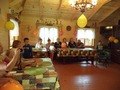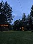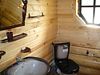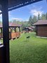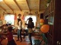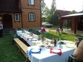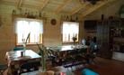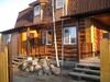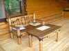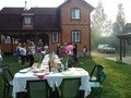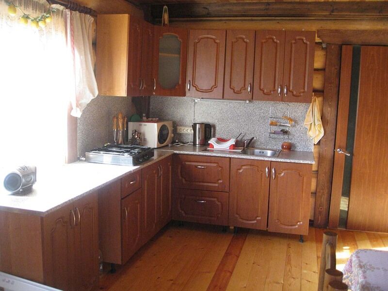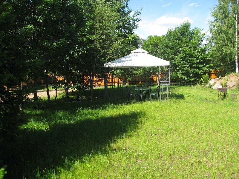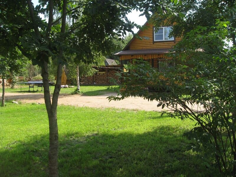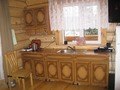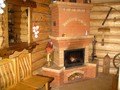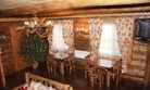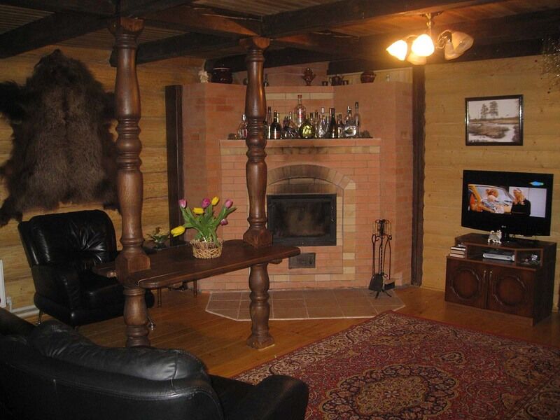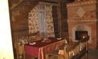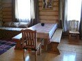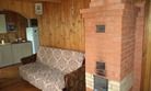 Первый этаж — большой каминный зал в стиле деревенского кафе (камин-печь, дубовые столы со скамьями, спутниковое телевидение), просторная оборудованная кухня с кирпичной печью, одна спальня, санузел, стиральная машина, очень просторная открытая веранда с деревянной и пластиковой мебелью.