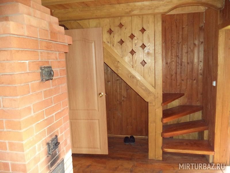 Первый этаж — просторная спальня-студия (печь, двуспальная кровать, мягкий гарнитур, разборный диван, буфет, телевизор, шкаф), веранда-столовая, полностью оснащённая кухня, санузел с душевой кабиной.