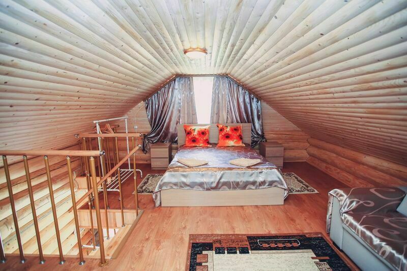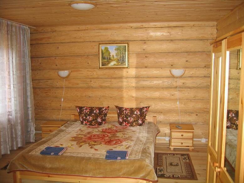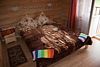 - роскошная спальня на втором этаже с большой двуспальной кроватью, тахтой, комодом и телевизором с антенной триколор.