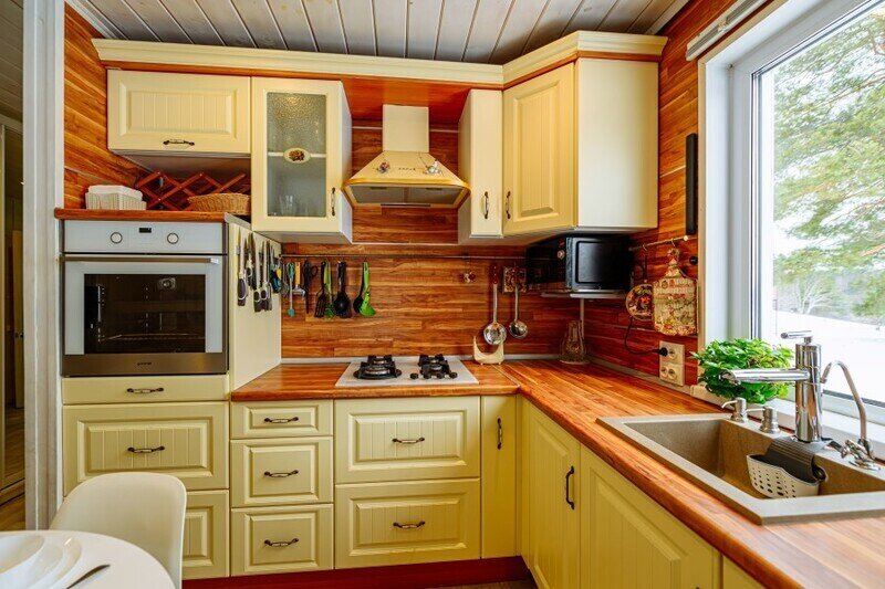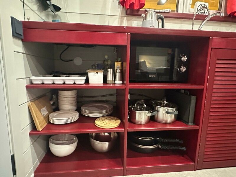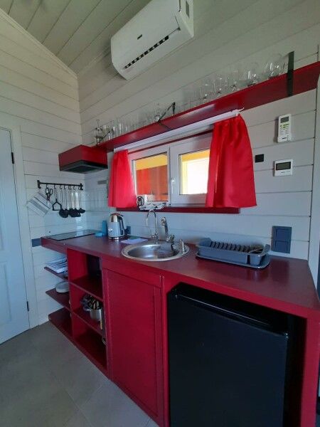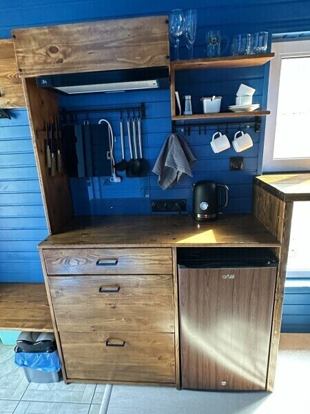 Также в домах оборудована кухня, на которой есть все необходимое для готовки. А на прилегающей территории имеется мангальная зона с дровами.