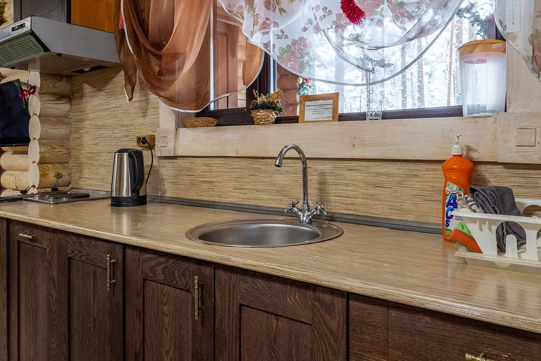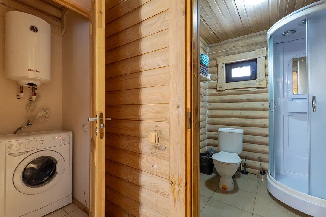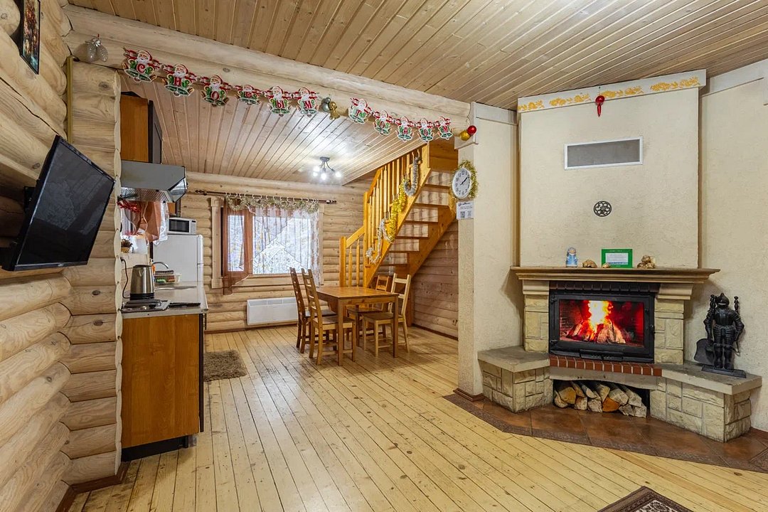 Ванная комната, оснащенная финской сауной, душевой кабиной, санузлом, раковиной, теплым полом, феном, бойлером на 100 л., Кухня оборудована плитой, посудомоечной машиной, холодильником, микроволновой печью, электрическим чайником. В гостиной расположены: уютный диван, дровяной камин и телевизор (DVD).