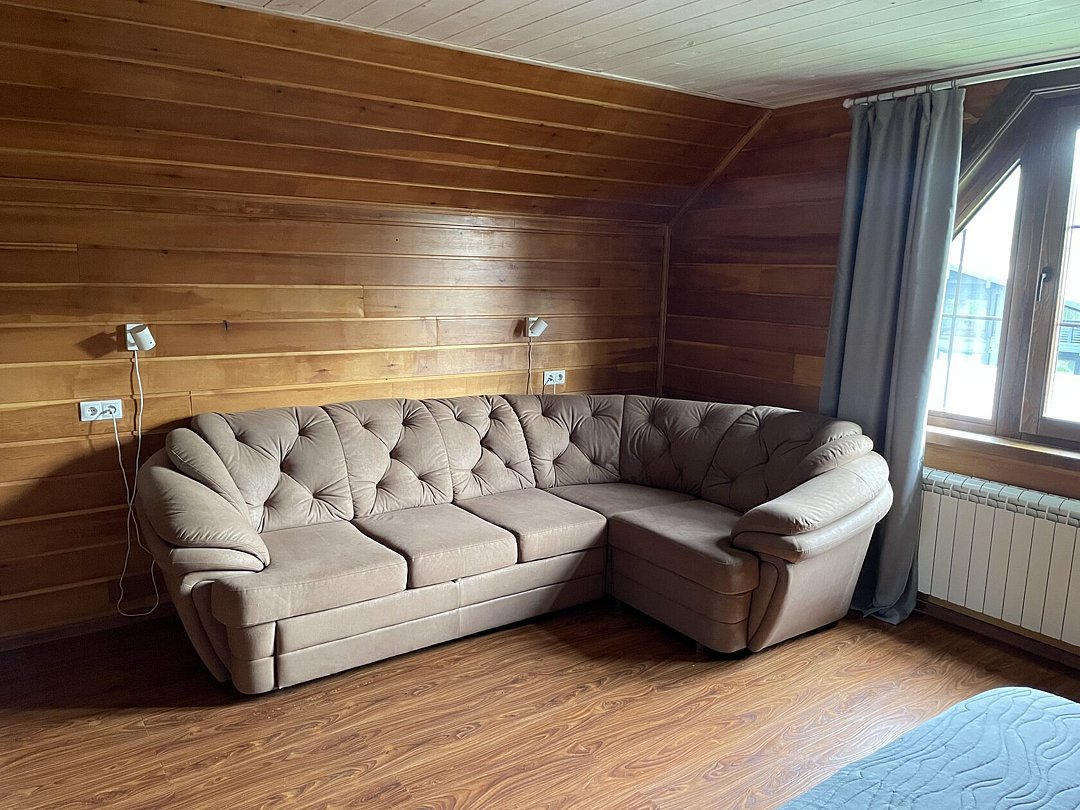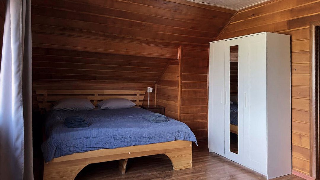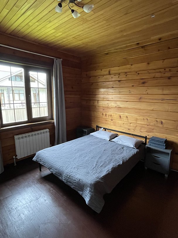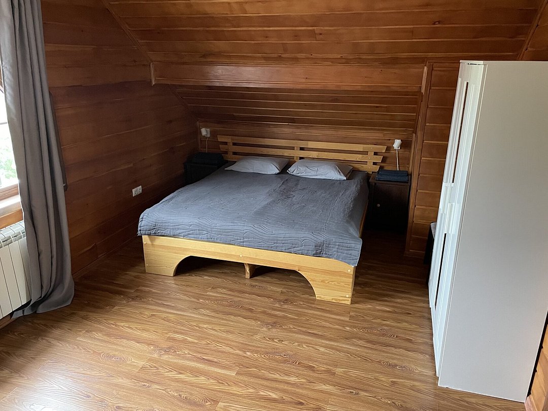 Дом вмещает до 18 гостей, предоставляя достаточно пространства для всех, а также включает в себя все необходимые для проживания удобства: санузлы, кухню и технику. В тёплое время года вы сможете искупаться в каркасном бассейне на территории.