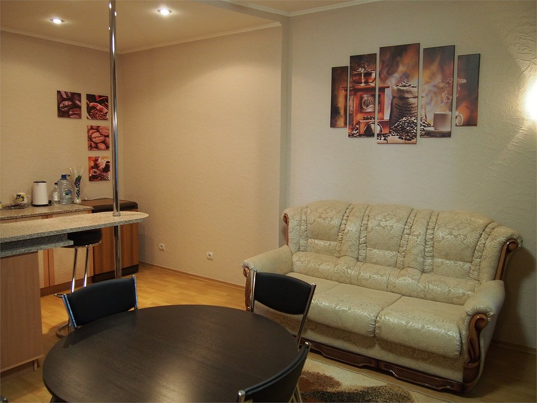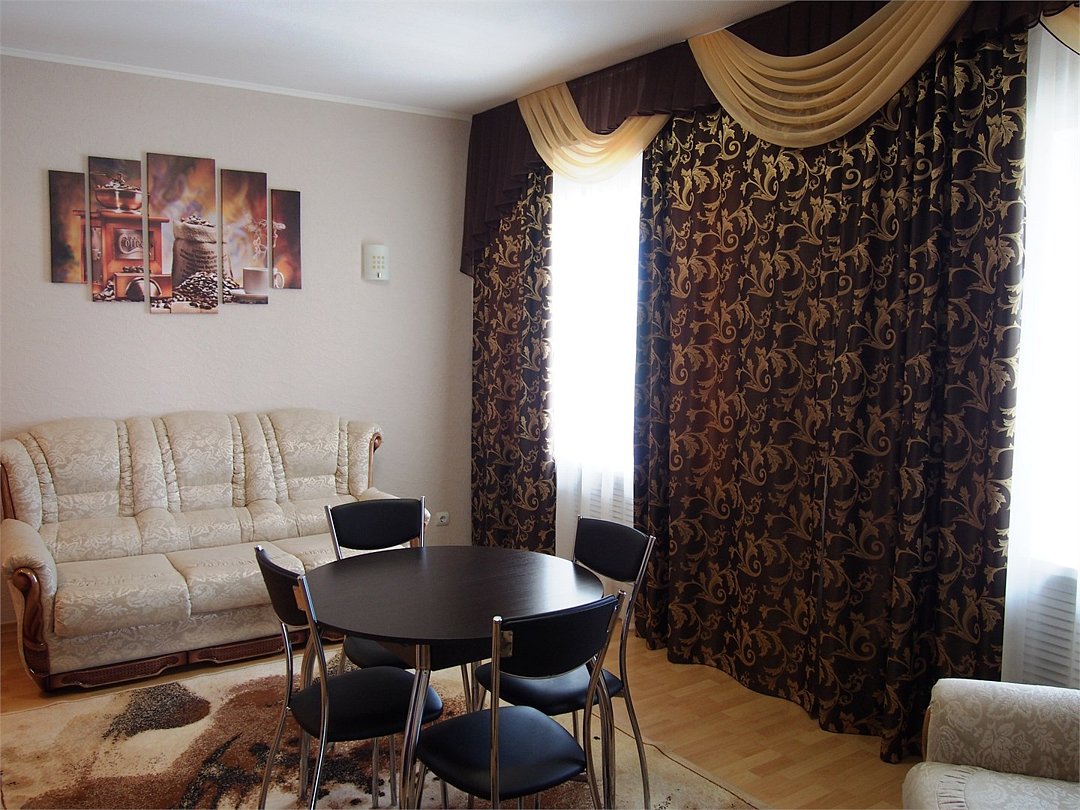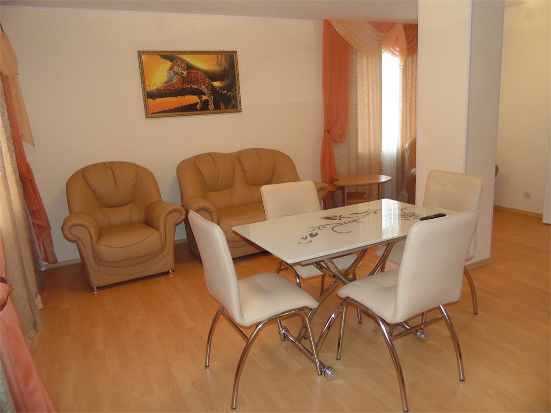 телевизор, Wi-Fi, холодильник, банные полотенца, односпальная кровать, диван, кресла, стулья, шкаф для одежды, обеденный стол, пуфики, две комнаты, набор посуды, минеральная вода, унитаз, гостиная зона, душ, вид на город, кулер на этажеВ гостиничном номере