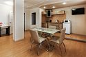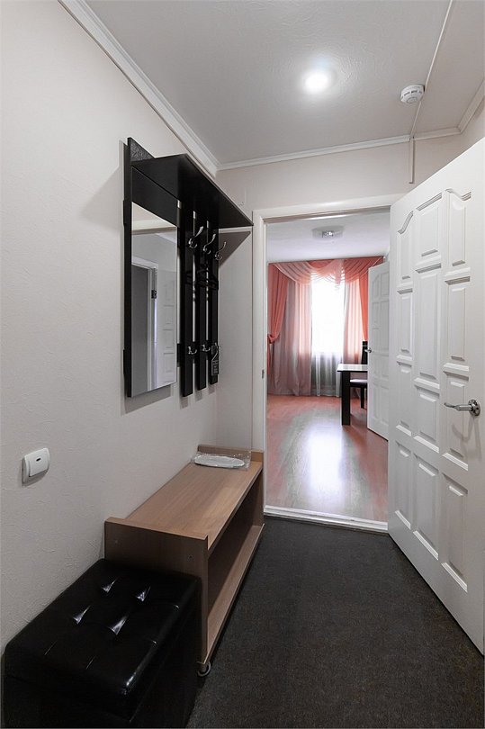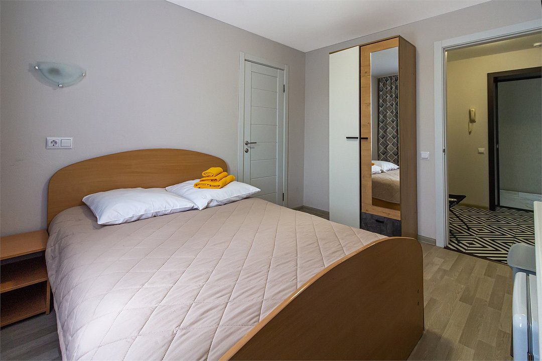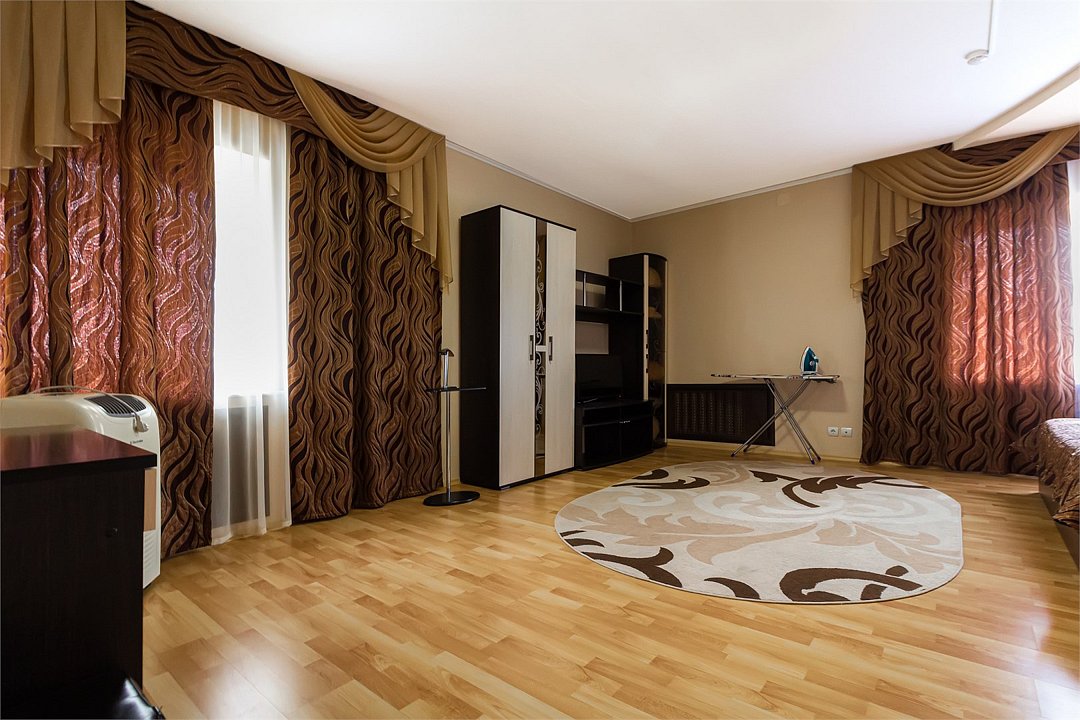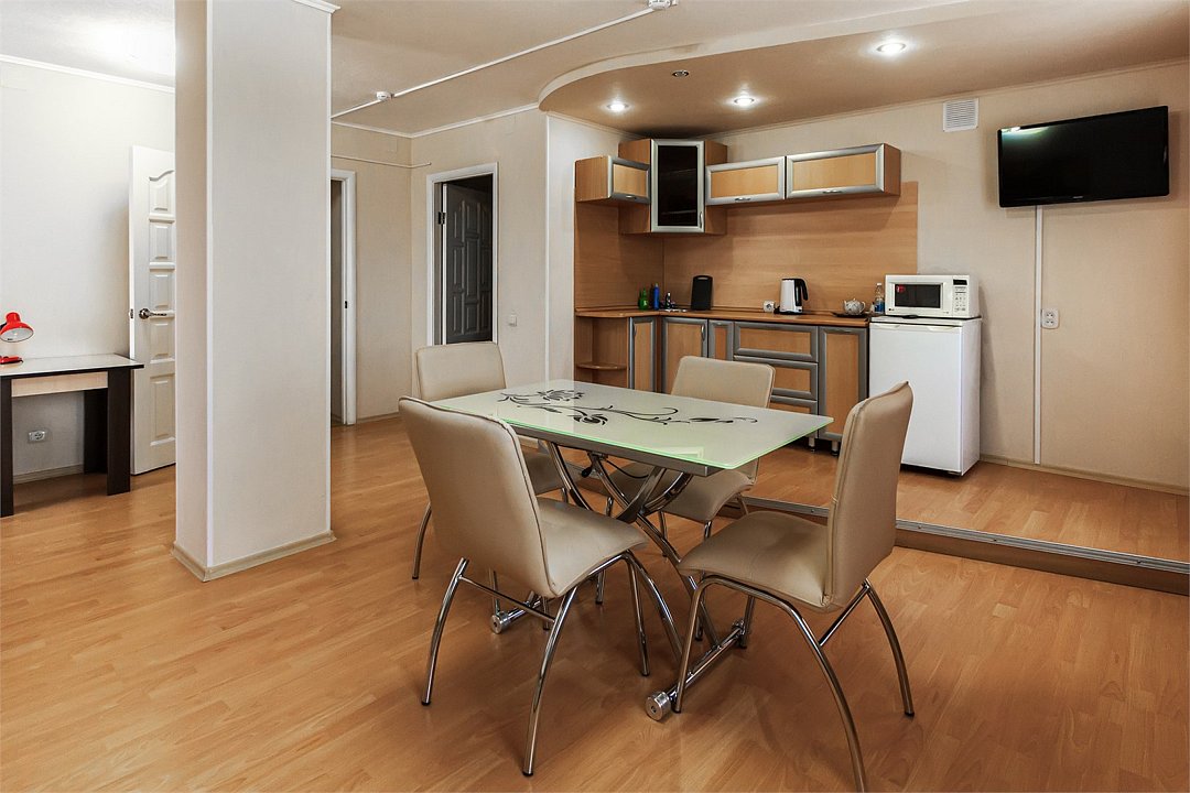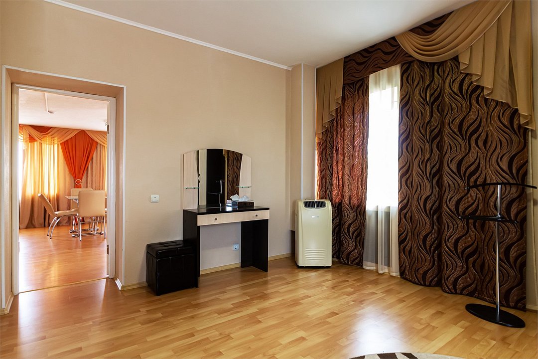 два телевизора, кабельное телевидение, Wi-Fi, холодильник, светильник, фен, микроволновая печь, обогреватель, ванна, водонагреватель, банные принадлежности, халаты, банные полотенца, тапочки, двуспальная кровать, диван, кресла, тумбы, стулья, шкаф для одежды, вешалки, обеденный стол, багажная тумба, барная стойка, зеркало, пуфики, ковер, мебельный гарнитур, две комнаты, кухня, чайный набор, набор посуды, обслуживание номеров, чайник, унитаз, мягкая мебель, питьевая вода, обеденная зона, гостиная зона, отопление, отдельный вход в номер, вид на город, кресло, общая ванная комнатаВ гостиничном номере