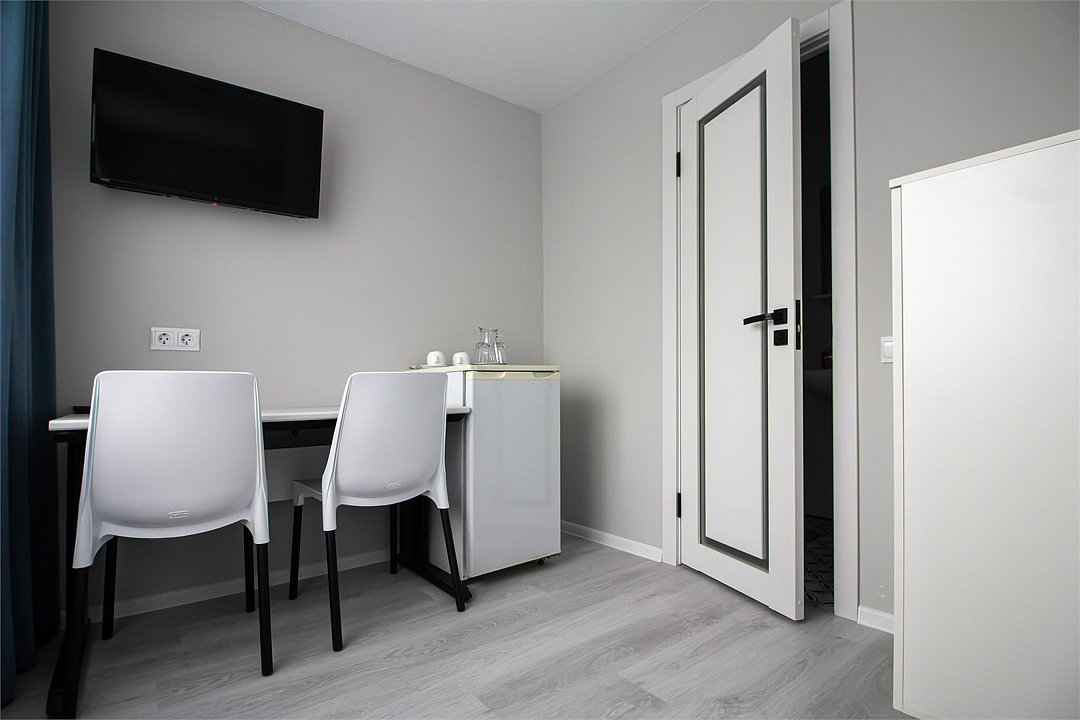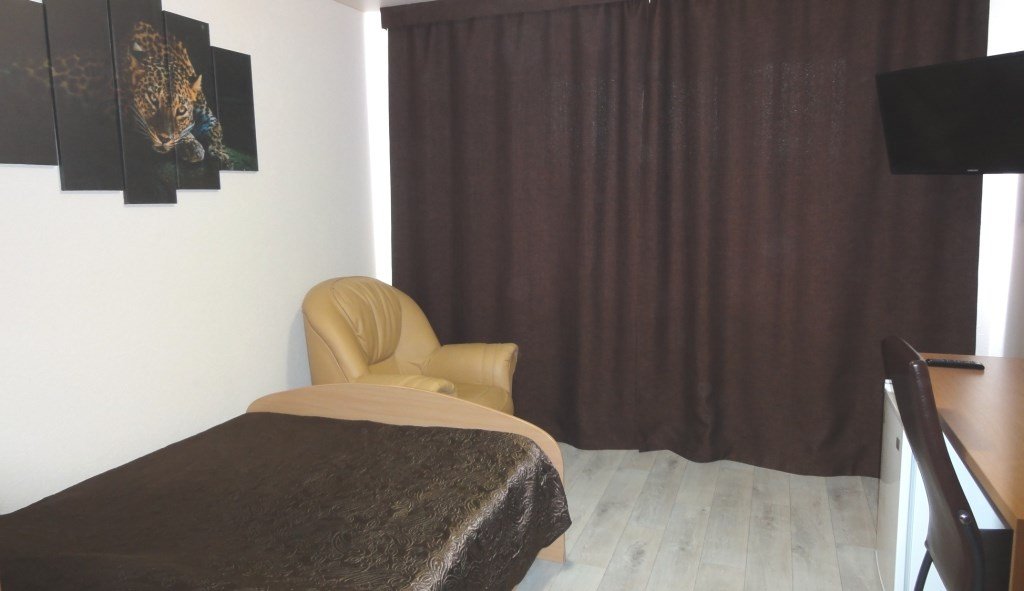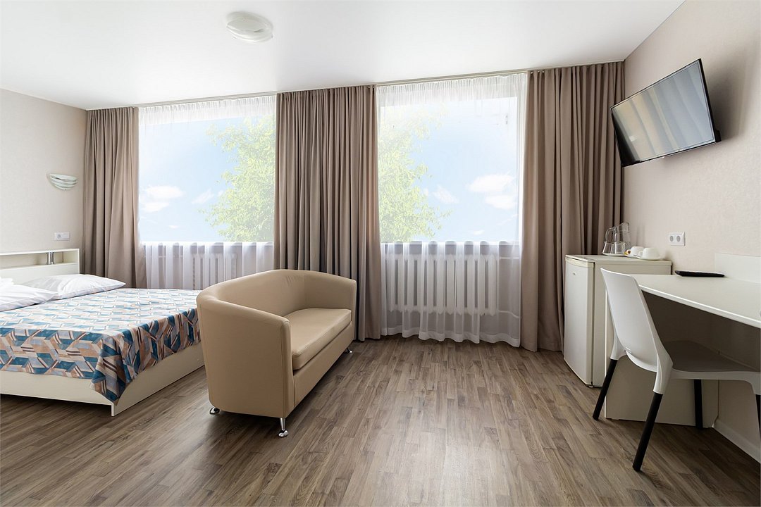 телевизор, Wi-Fi, холодильник, банные полотенца, полутораспальная кровать, стулья, шкаф для одежды, журнальный столик, чайный набор, унитаз, душ, вид на город, кулер на этаже, креслоВ гостиничном номере