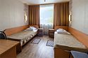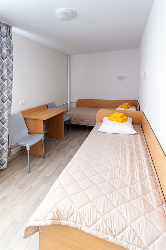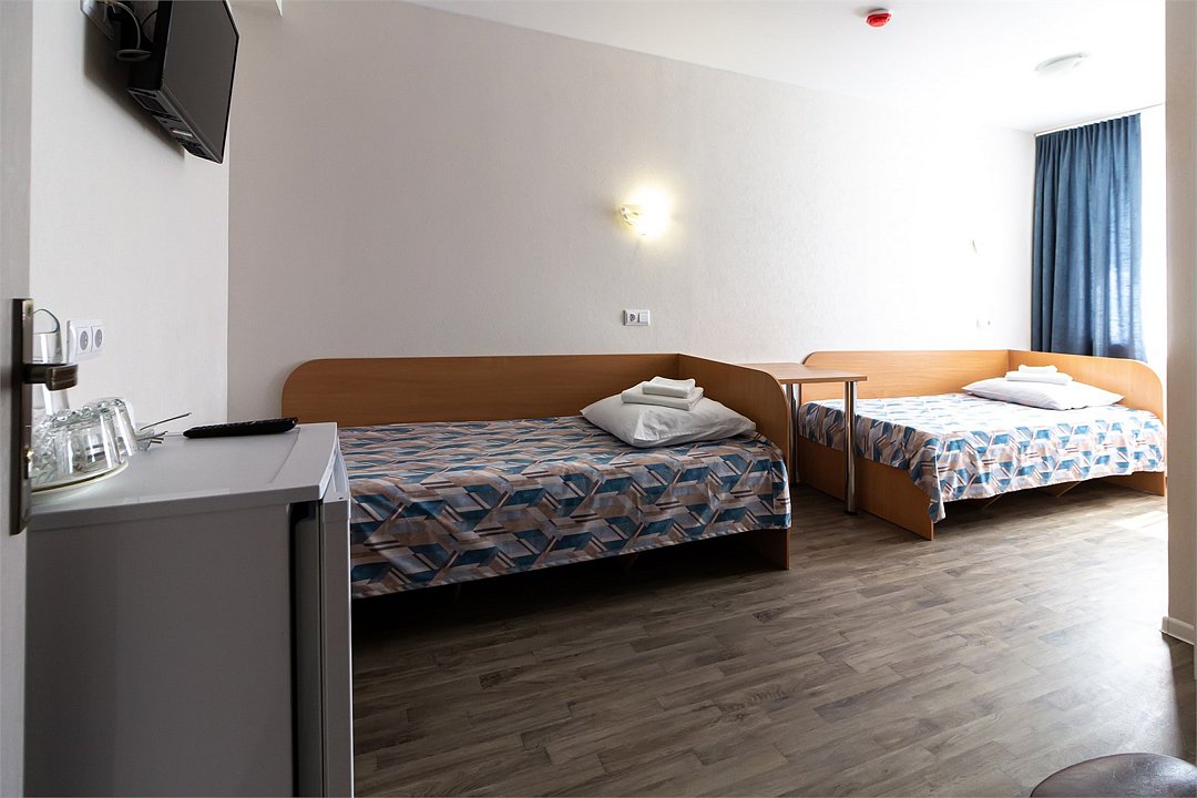 телевизор, Wi-Fi, холодильник, банные полотенца, тумбы, стулья, шкаф для одежды, вешалки, обеденный стол, набор посуды, минеральная вода, унитаз, душ, вид на город, кулер на этаже, кресло, три односпальные кроватиВ гостиничном номере