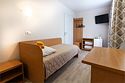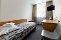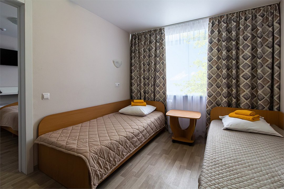 телевизор, кабельное телевидение, Wi-Fi, холодильник, светильник, фен, банные полотенца, две односпальные кровати, стулья, шкаф для одежды, письменный стол, зеркало, унитаз, душВ гостиничном номере