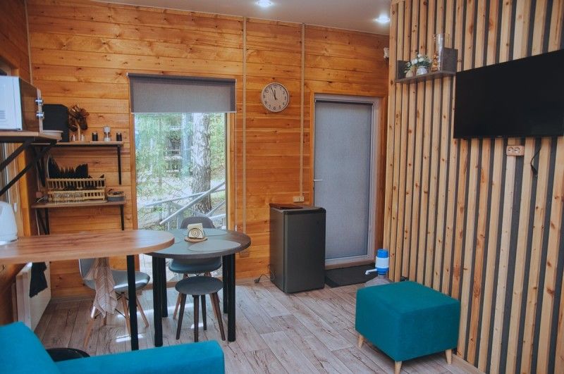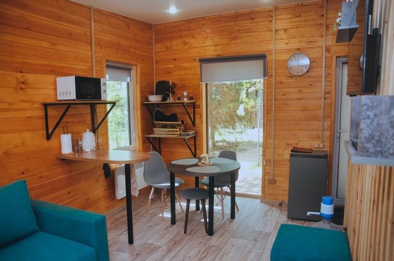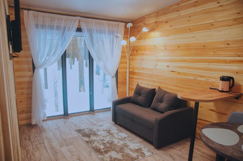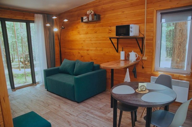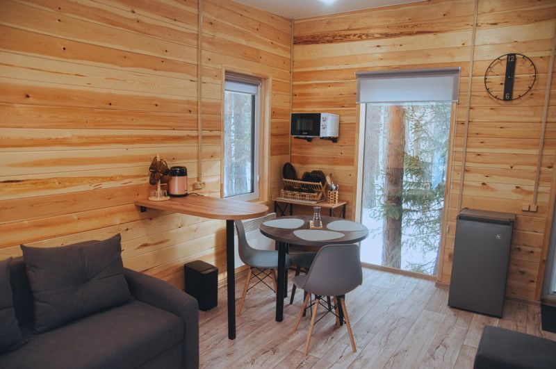 Отапливаемый коттедж с уютным интерьером, вмещает до четырех человек. Внутри есть спальня и два спальных места на раскладном диване, кухня-гостиная с панорамным окном с видом на сосновый бор, телевизор.