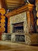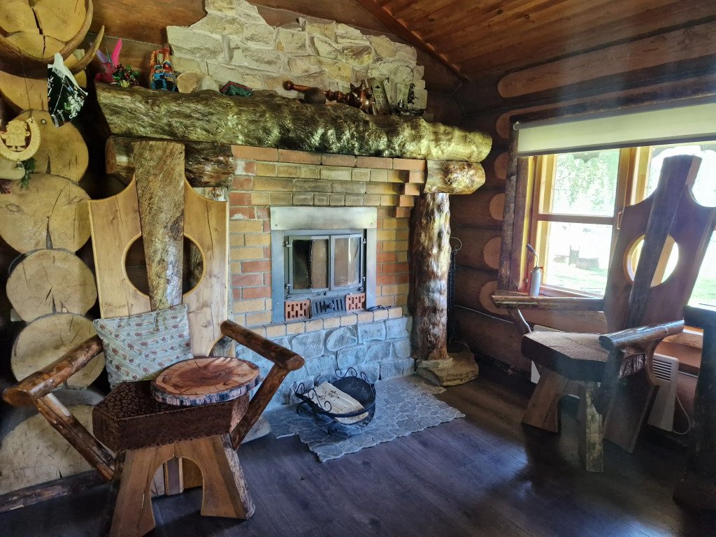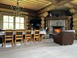 - гостиная: обеденный стол, телевизор, камин, диван и два мягких кресла;
