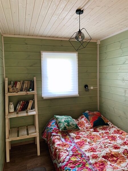 Гостиная с огромными окнами и видом на озеро, туалетная комната с душевой кабиной, раковиной, унитазом, бойлером и теплым полом. Кухня-столовая с холодильником, мойкой, газовой плитой, посудой и обеденным столом. Спальня с полноценной двуспальной кроватью. Открытая терраса, защищенная от дождя и ветра с уютной релакс-зоной в виде качелей. В домике могут свободно разместиться 4 человека и небольшой питомец.