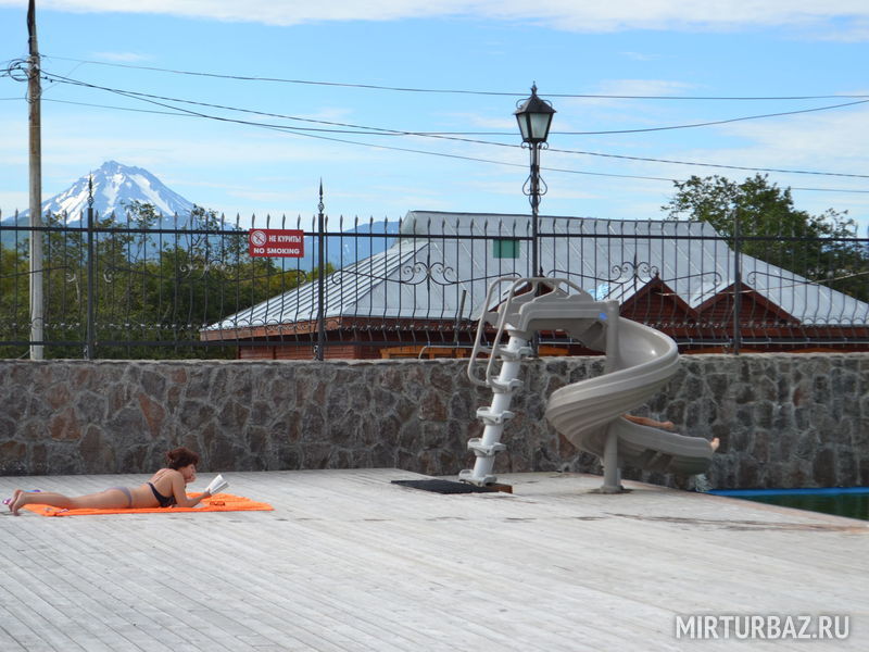 В бассейне вода, нагретая природой. Термальные воды Камчатки - одна из ее визитных карточек, воду не подогревают, а получают ее горячей напрямую из недр, лишь небольшое количество холодной воды необходимо для оптимальной и комфортной температуры. Такая вода очень полезная для организма в целом, и содержит в себе много лечебных свойств.