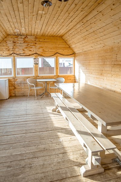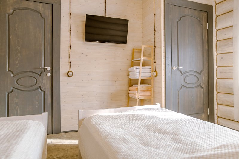 Для вас подготовлены уютный двухэтажный гостевой дом с 8 спальными местами и одноэтажный дом с 2-мя раздельными спальнями на 6 спальных мест так же из натурального бревна. На первом этаже дома уютная гостиная с кухонной зоной, которая оснащена бытовой техникой для самостоятельной готовки.
