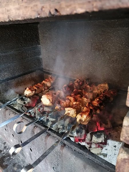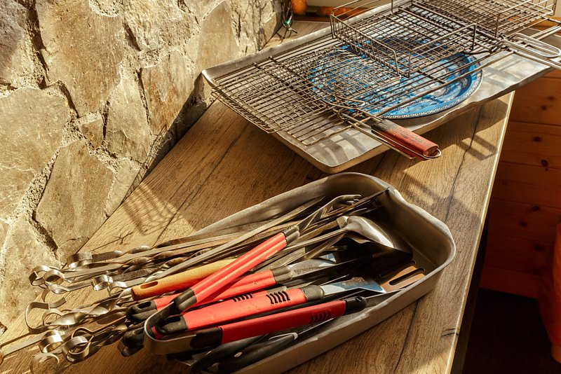 В беседке печь-мангал, мойка, большой разделочный стол со всем необходим для барбекю, холодильник, большой деревянный стол для большой компании, два кресла, музыкальная колонка. Беседка полностью застеклена. На улице рядом с беседкой вторая мангальная зона.