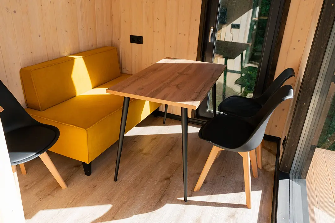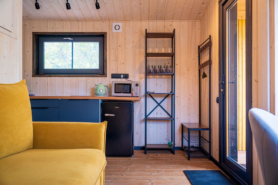 На живописной территории глэмпинга гостей ждет общая беседка, созданная для совместного отдыха и уюта. Здесь можно воспользоваться холодильником и микроволновой печью, что делает ее идеальным местом для хранения свежих продуктов и быстрого разогрева еды.