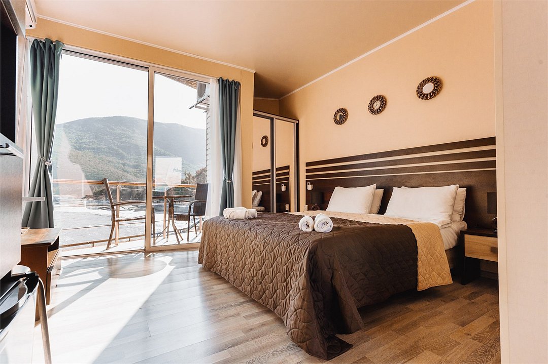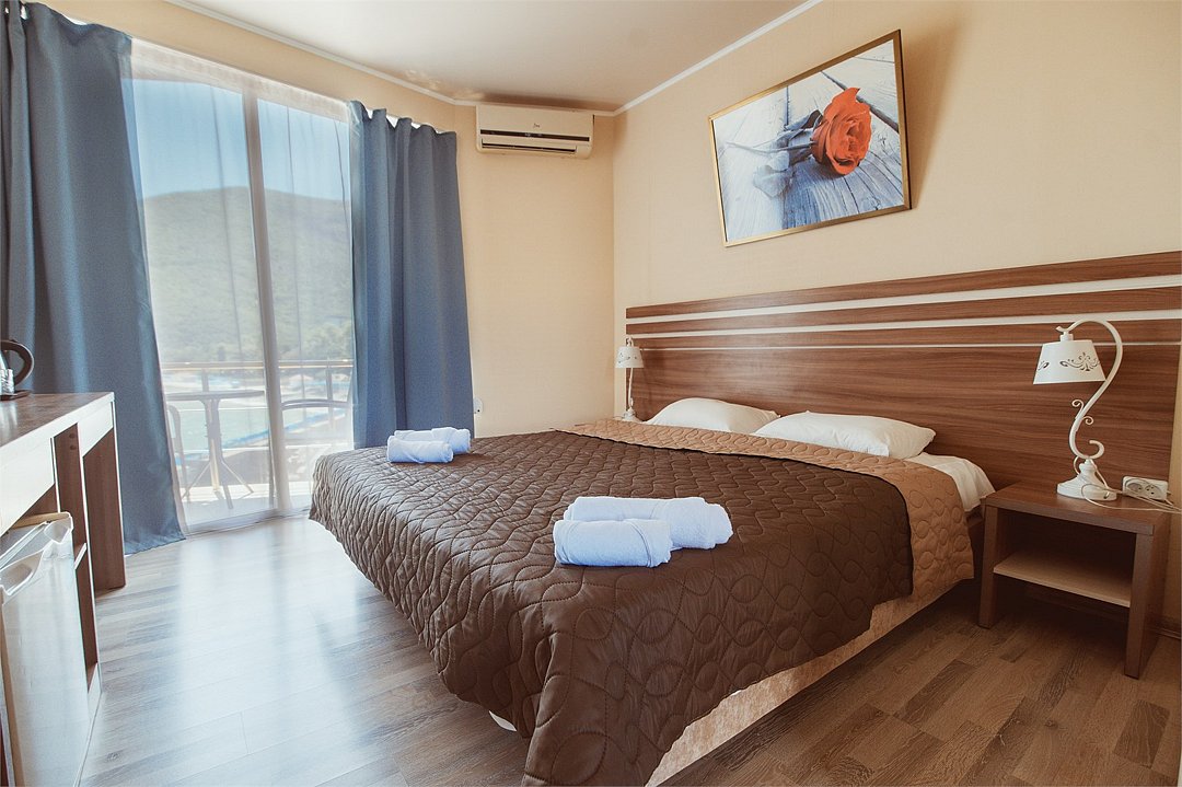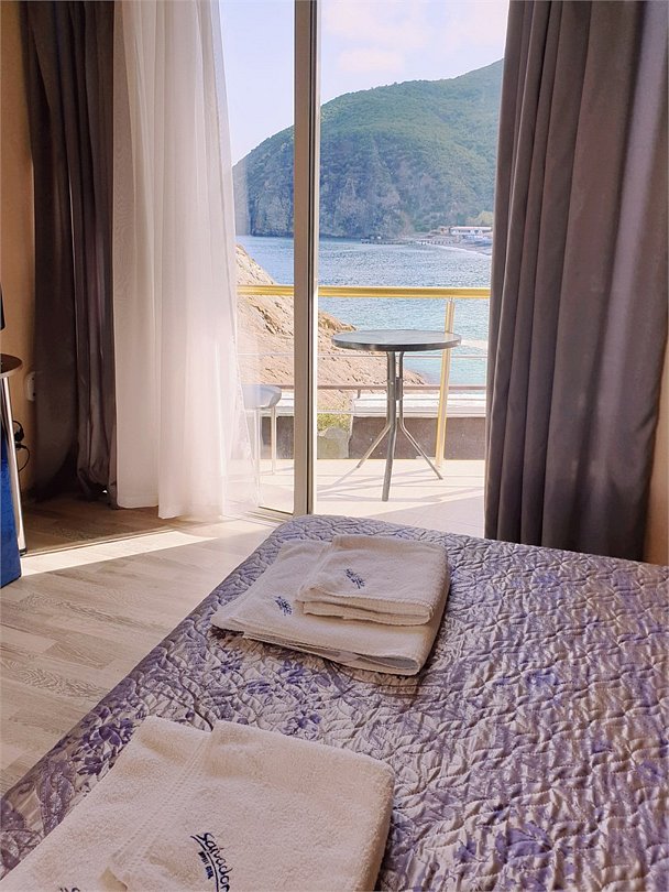 Номер улучшенной категории с панорамными окнами в пол, с завораживающим видом на море и гору "Аю-Даг". Номер оснащен современной мебелью, с совмещенной двуспальной кроватью или 2-я раздельными, на выбор. В номере могут комфортно разместиться 2 человека, так же возможно одно дополнительное место. Номер расположен на 2-м этаже. В категории улучшенный стандарт несколько номеров, все они имеют одинаковое оснащение, но отличаются по дизайну. Бронируется не номер по фото, а категория. Обращаем Ваше внимание, что данная категория имеет 5 номеров, в случае, если один номер не будет доступен на весь период проживания, то система сделает бронь с переездом из одного номера в другой номер данной категории, либо выше (в случае такой брони, отель обязательно уведомит гостя).Услуги и удобства