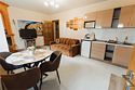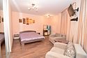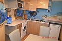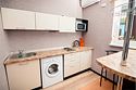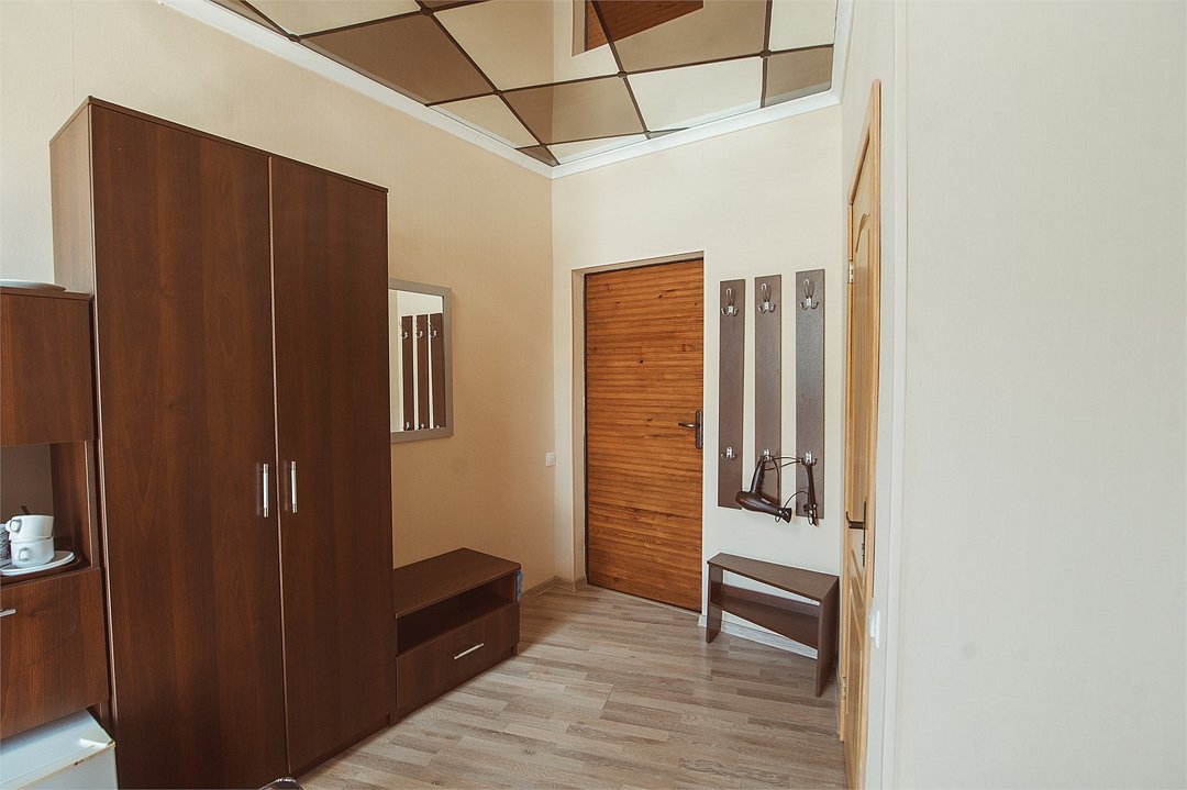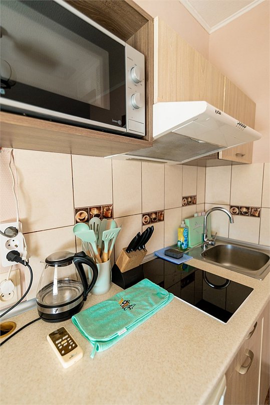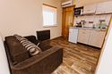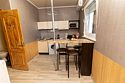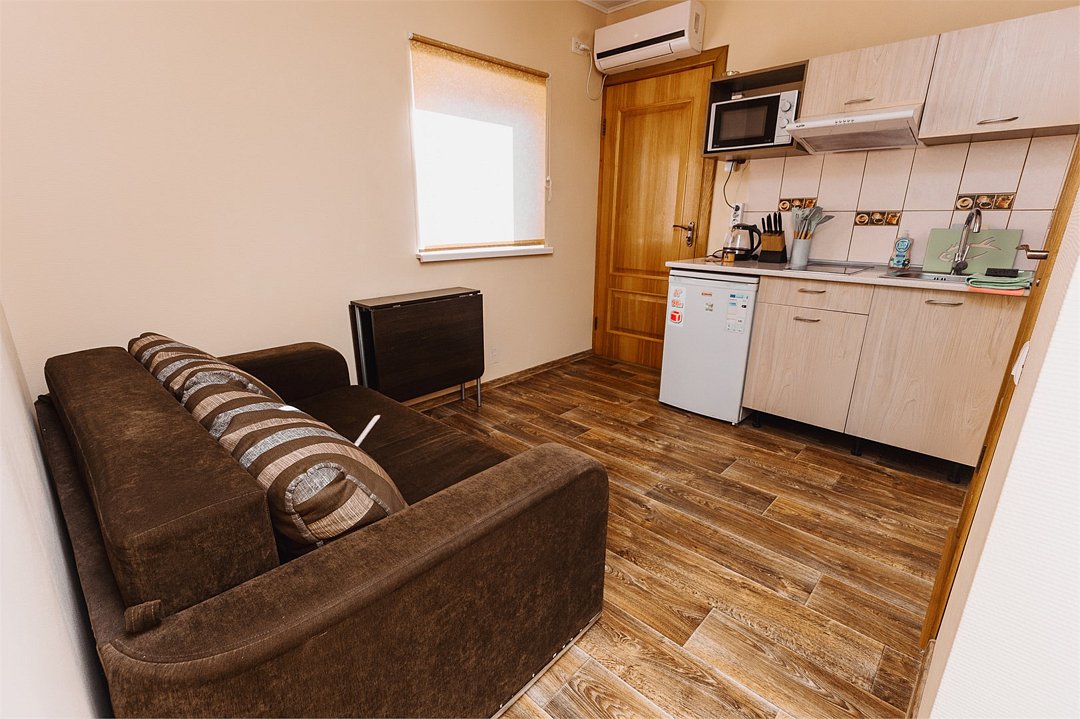 Комфортный номер с кухней, современной мебелью, с совмещенной двуспальной кроватью и раскладным креслом, так же в номере есть стиральная машина, что удобно для семьи с детьми. В номере могут комфортно разместиться 2-3 человека. Номер расположен на 1-м этаже.Услуги и удобства