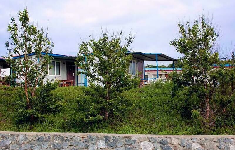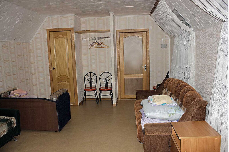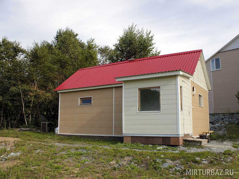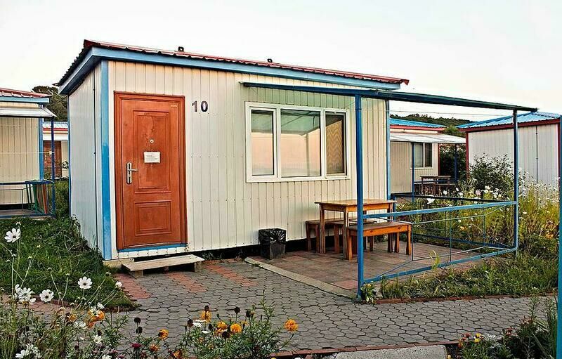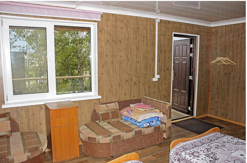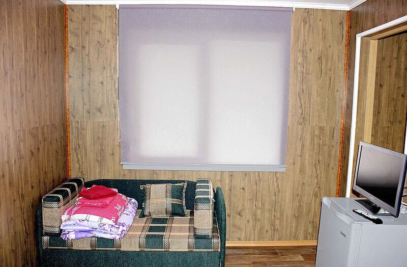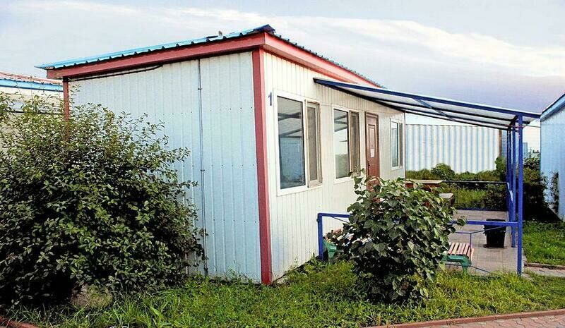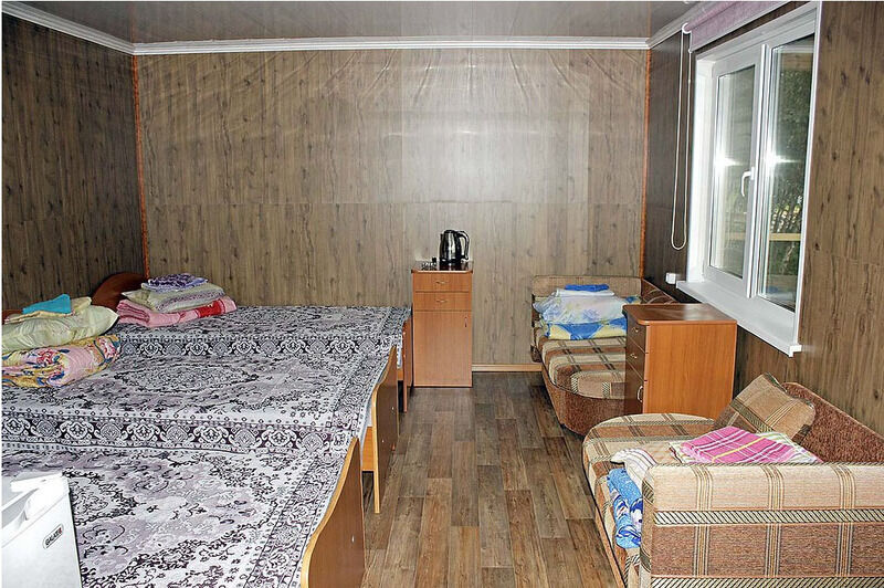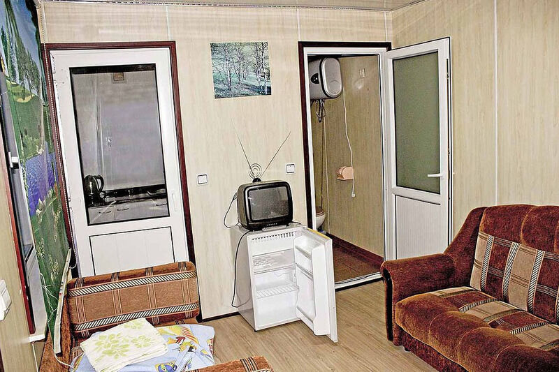 В домике: одна комната и туалет с умывальником (холодная вода). В комнате: две односпальных кровати (евростандарт), малогабаритный раскладной диван, электрический чайник, холодильник, телевизор (2 - 4 программы). Около домика свой маленький дворик, огороженная площадка под навесом, уличный стол, лавочка, 2 табурета.