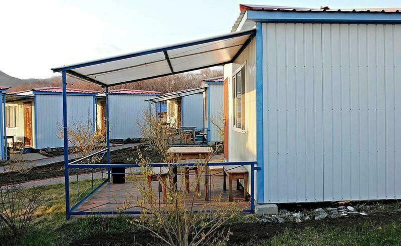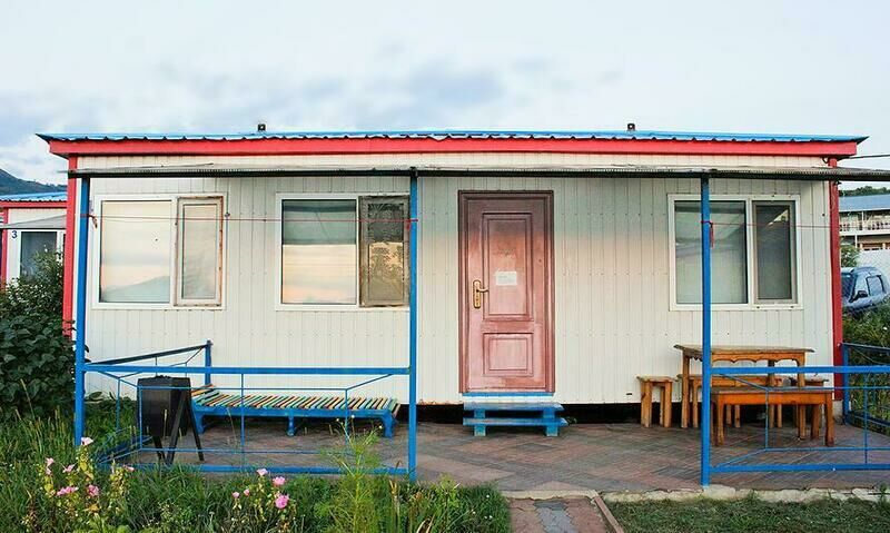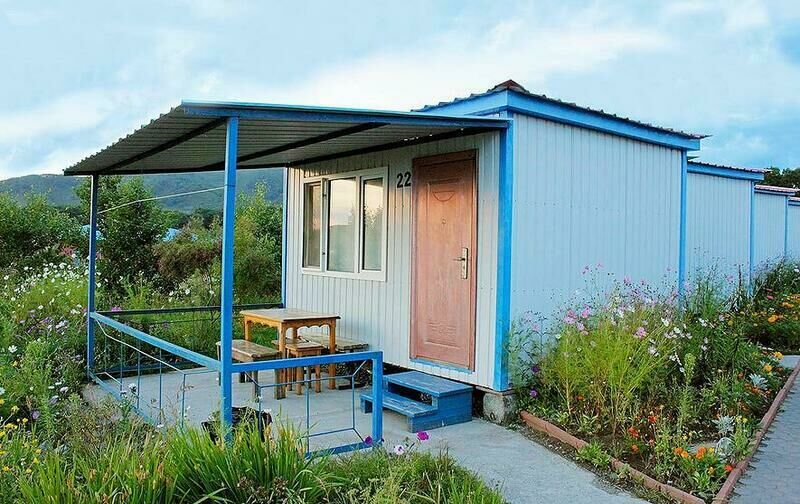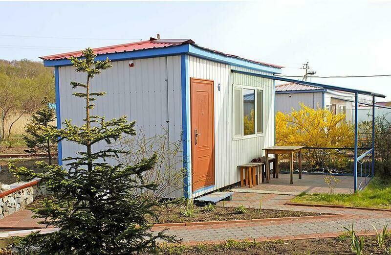 В домике: одна комната и туалет с умывальником, душ (горячая, холодная вода). В комнате: двуспальная кровать (евростандарт), электрический чайник, мини-холодильник, телевизор. Возможен вариант с двухярусной кроватью или двуспальным диваном. Около домика свой маленький дворик, огороженная площадка под навесом, уличный стол, лавочка, 2 табурета.
