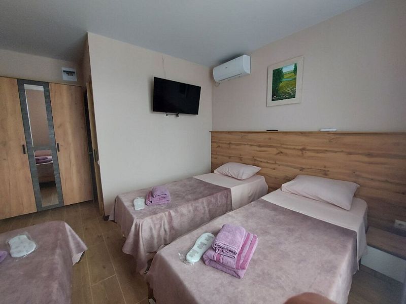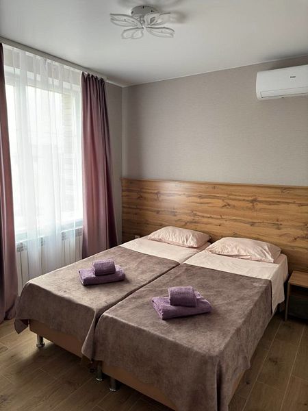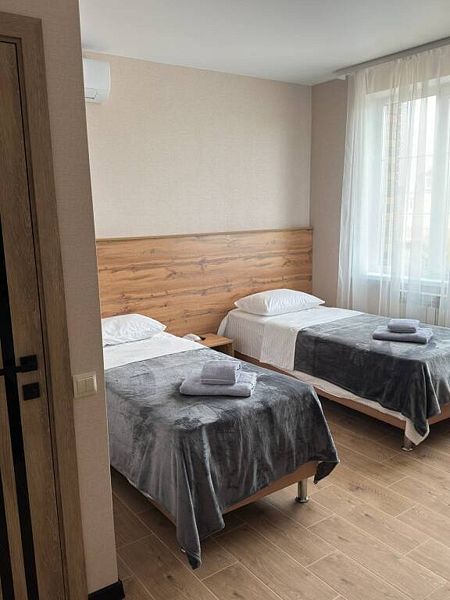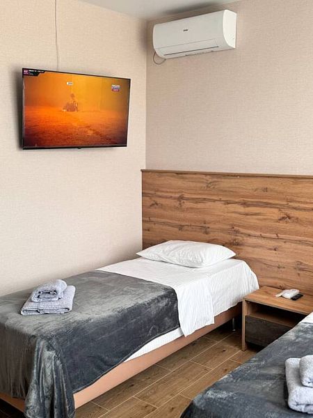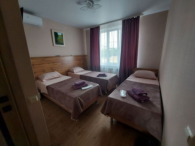 Данный номер оснащен тремя спальными местами. Конфигурация спальных мест возможна по вашему усмотрению: двуспальная кровать (состоящая из двух зафиксированных односпальных) + односпальная кровать или три раздельных односпальных кровати. Как и во всех наших номерах SMART TV, Wi-Fi с безлимитным доступом, сплит-система для регулирования комфортной температуры.