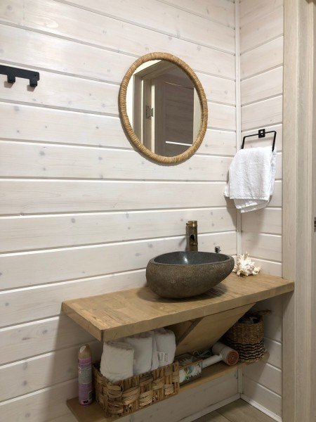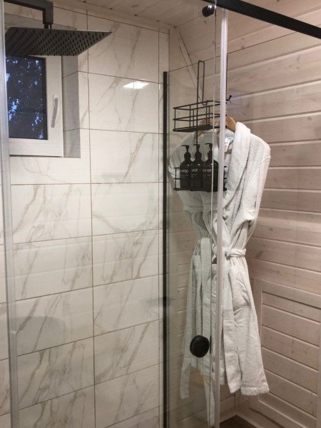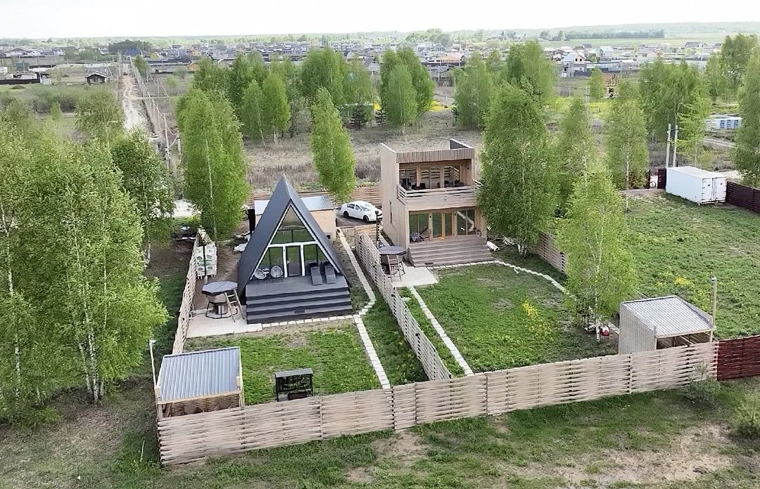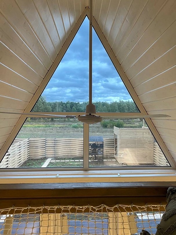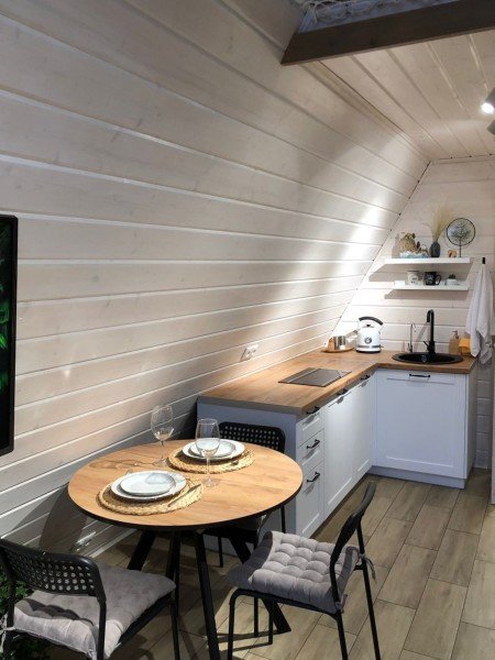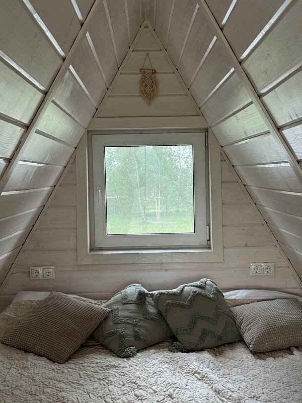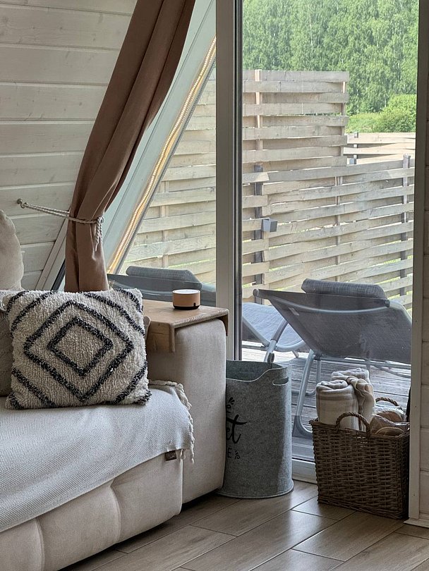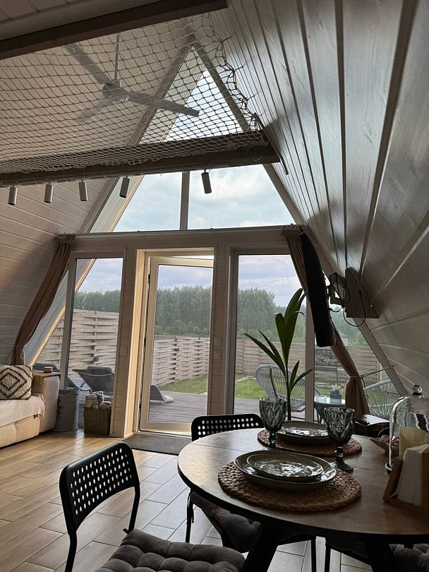 В доме гостиная с электрическим камином, сетка-гамак, полностью оснащённая кухня, питьевая вода, телевизор (Smart TV), колонка с Алисой. Есть проигрыватель виниловых пластинок, настольные игры, Wi-Fi. В доме 4 спальных места (на втором этаже двуспальная кровать Double king size 2х2м, на первом этаже раскладной двуспальный диван), комфортный санузел внутри дома.