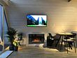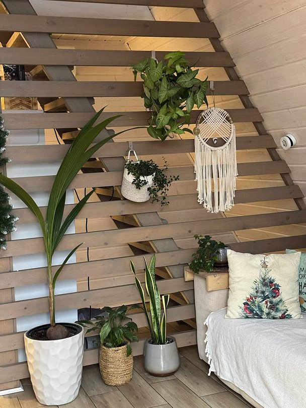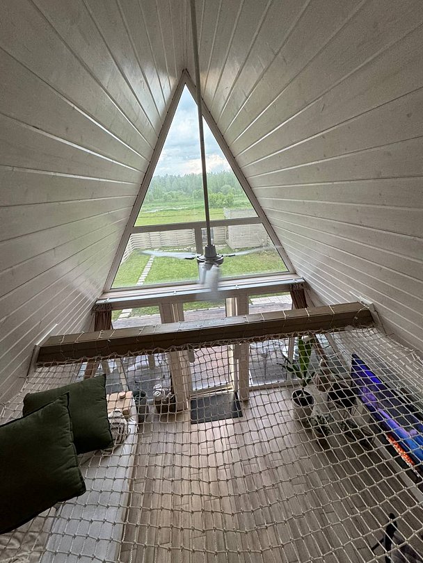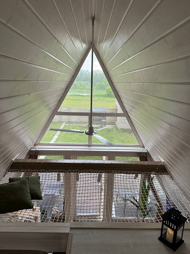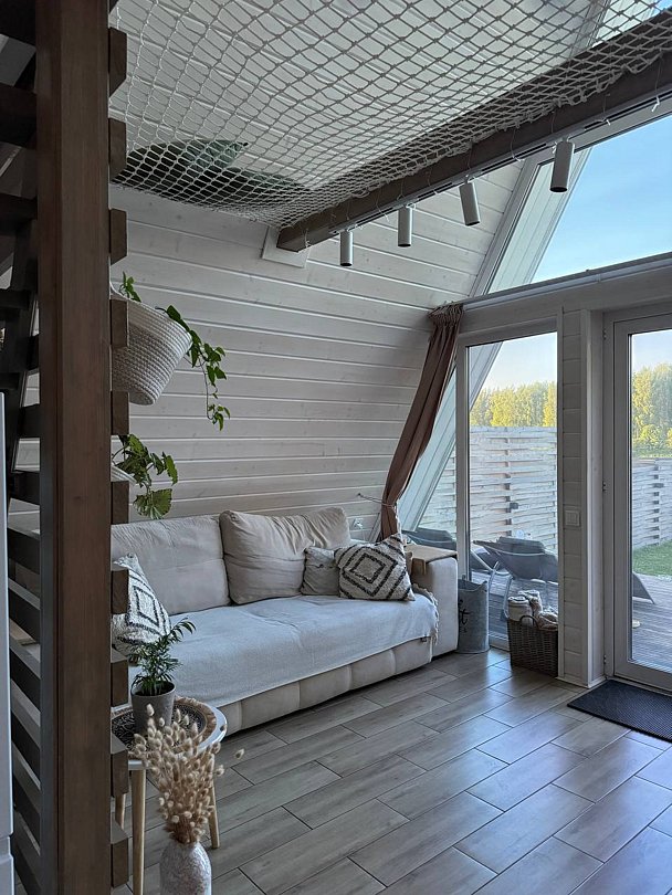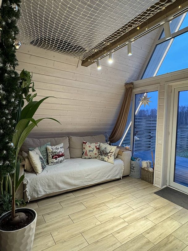 Дом порадует Вас просторной гостиной с очаровательным электрическим камином и подвесным гамаком. Полностью оборудованная кухня обеспечит все необходимое для приготовления блюд, а Smart TV, умная колонка Алиса и проигрыватель виниловых пластинок позаботятся о развлечениях. Настольные игры, Wi-Fi и комфортный санузел дополнят Ваши удобства.