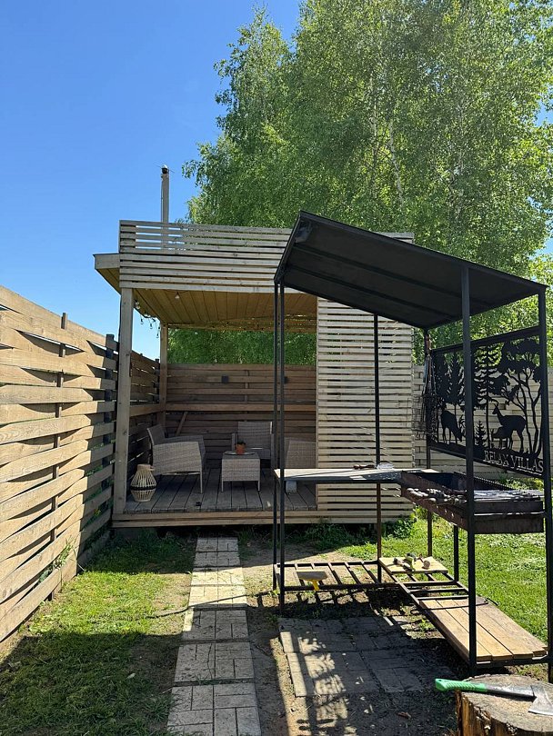 На территории дома разместились частный банный чан, мангальная зона и беседка. Любители активного отдыха могут взять напрокат каяк или квадроцикл.