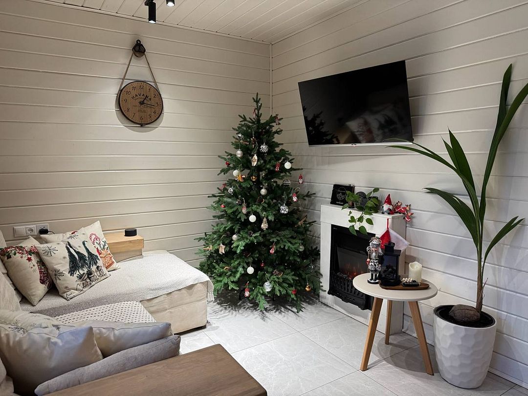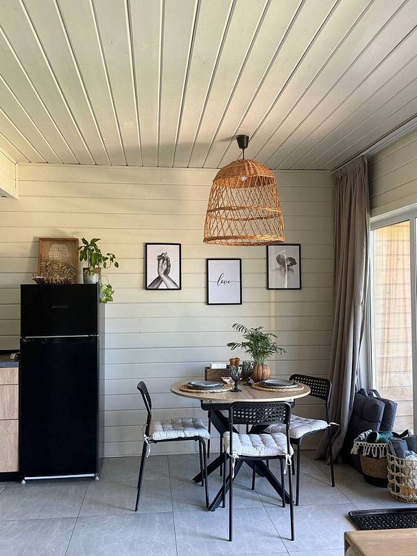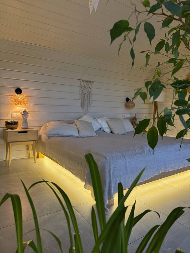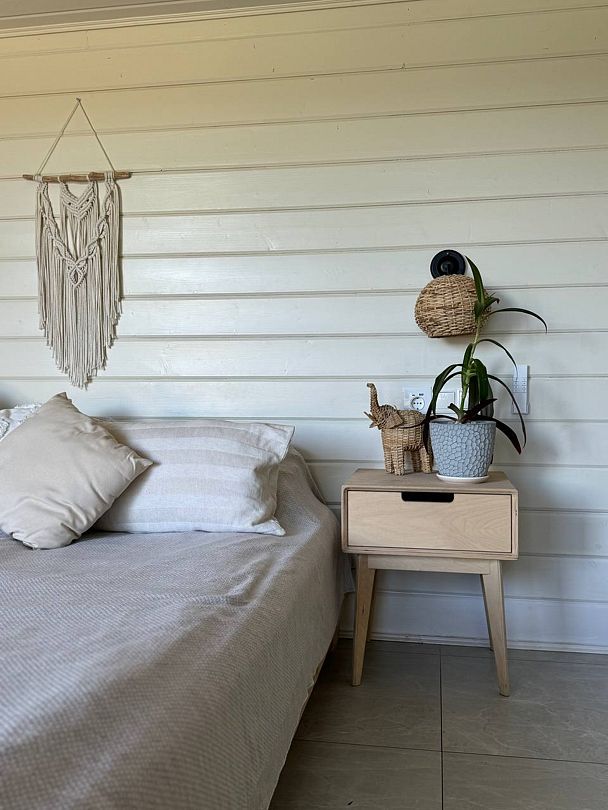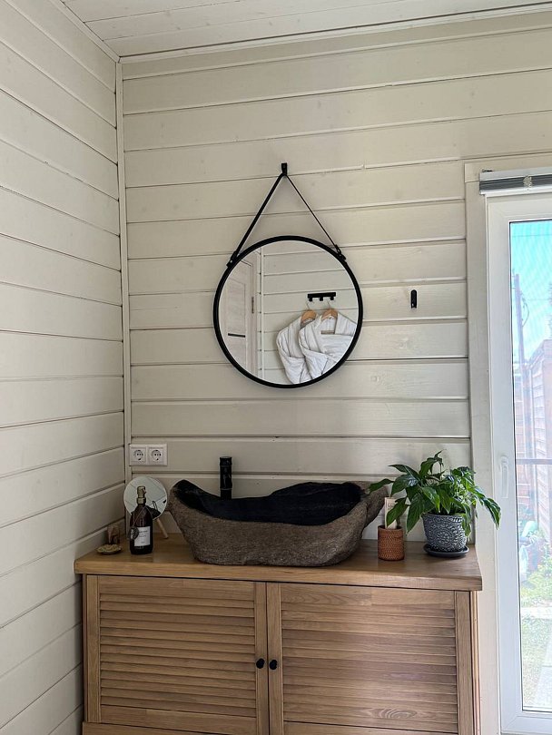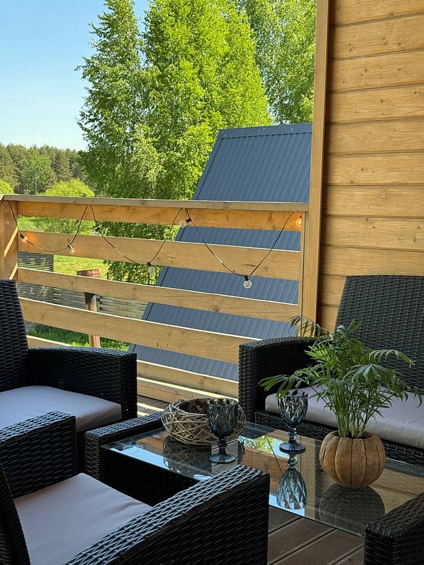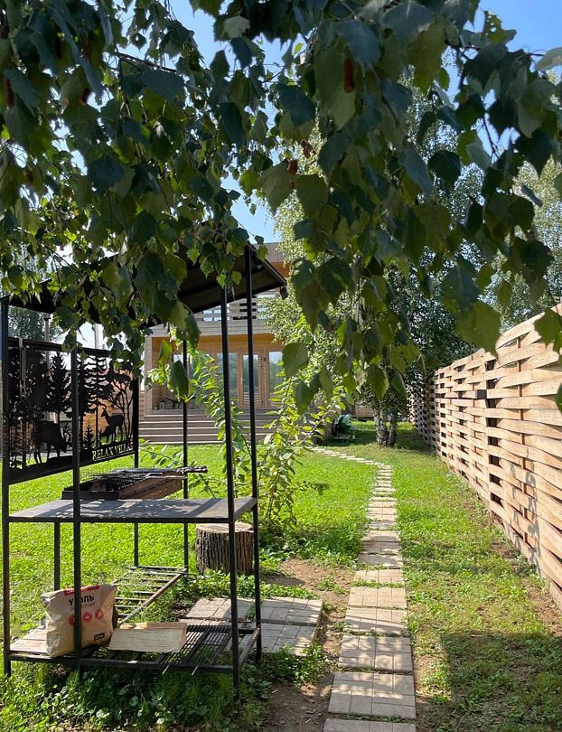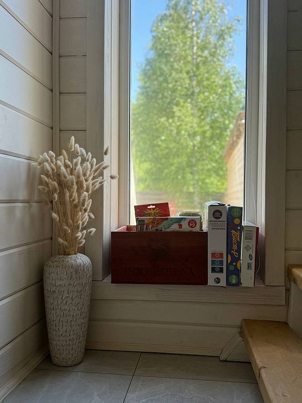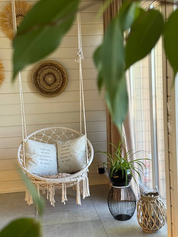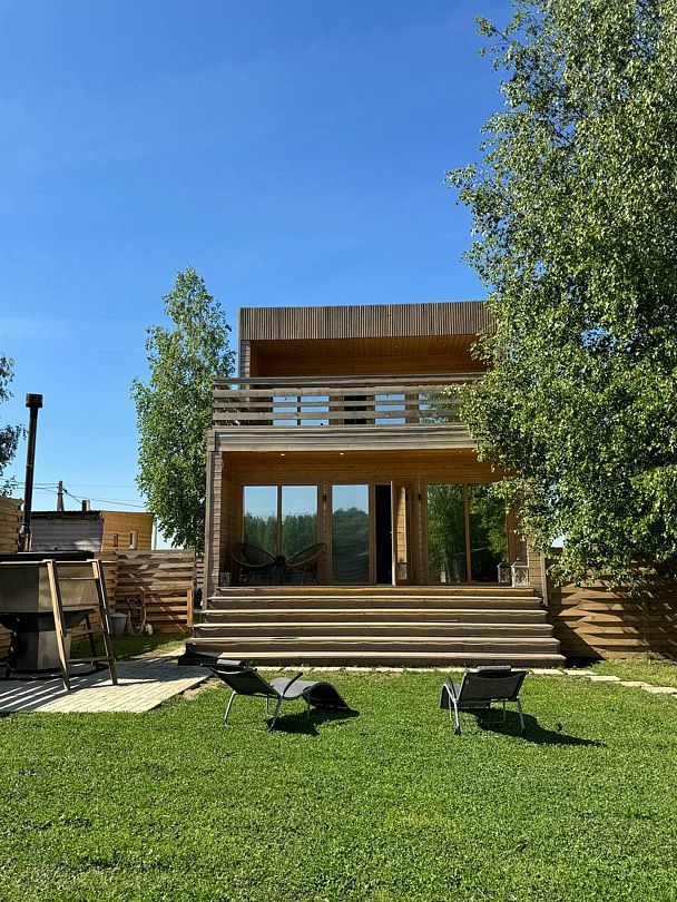 Для вас дом оборудован просторной спальней с подвесным креслом-гамаком и панорамным видом на реку, террасой с садовой мебелью для неспешного времяпрепровождения. В уютной гостиной можно провести вечер у камина. Кухня оснащена всем необходимым для готовки. Также к вашим услугам телевизор со Smart TV, колонка с Алисой и быстрый Wi-Fi.