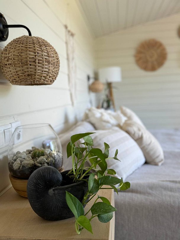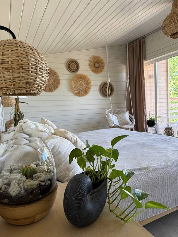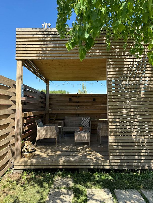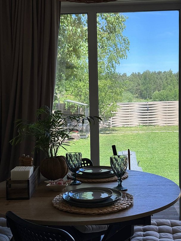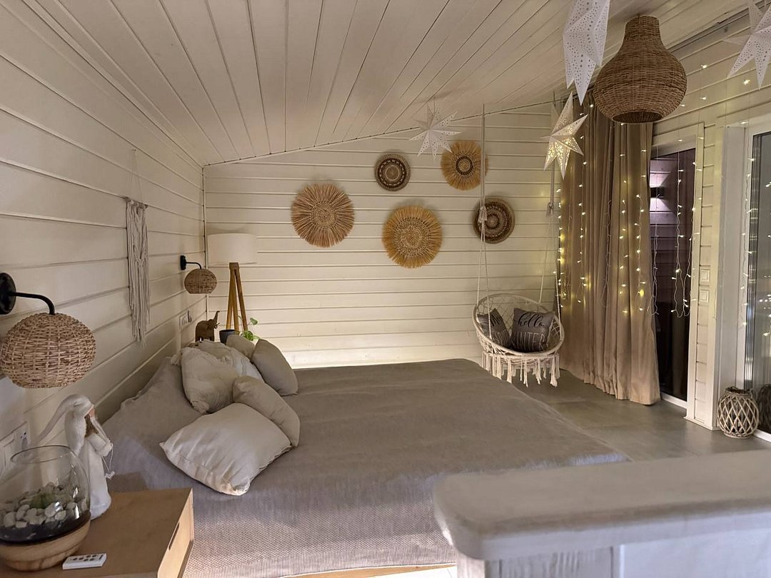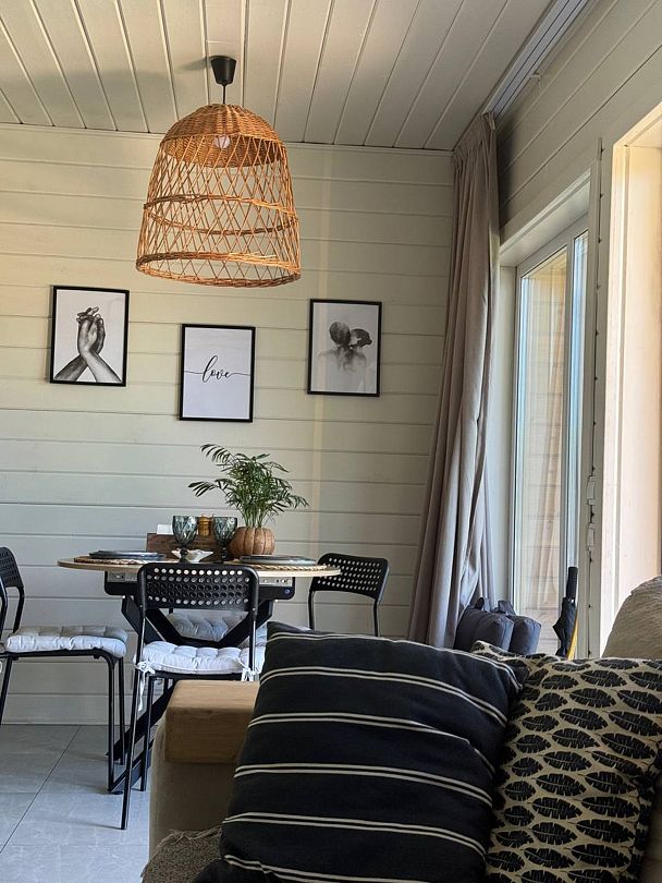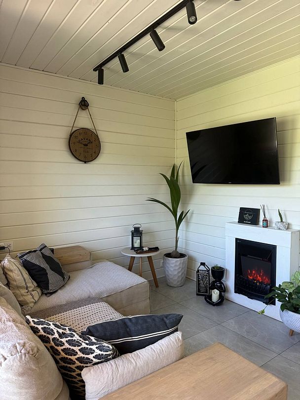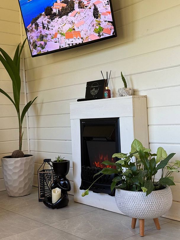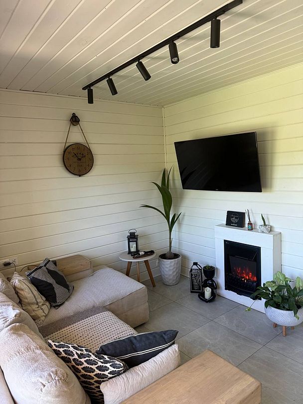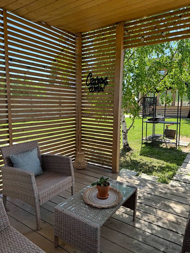 Для вас дом оборудован просторной спальней с подвесным креслом-гамаком и панорамным видом на реку, террасой с садовой мебелью для неспешного времяпрепровождения. В уютной гостиной можно провести вечер у камина. Кухня оснащена всем необходимым для готовки. Также к вашим услугам телевизор со Smart TV, колонка с Алисой и быстрый Wi-Fi.