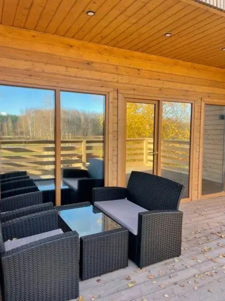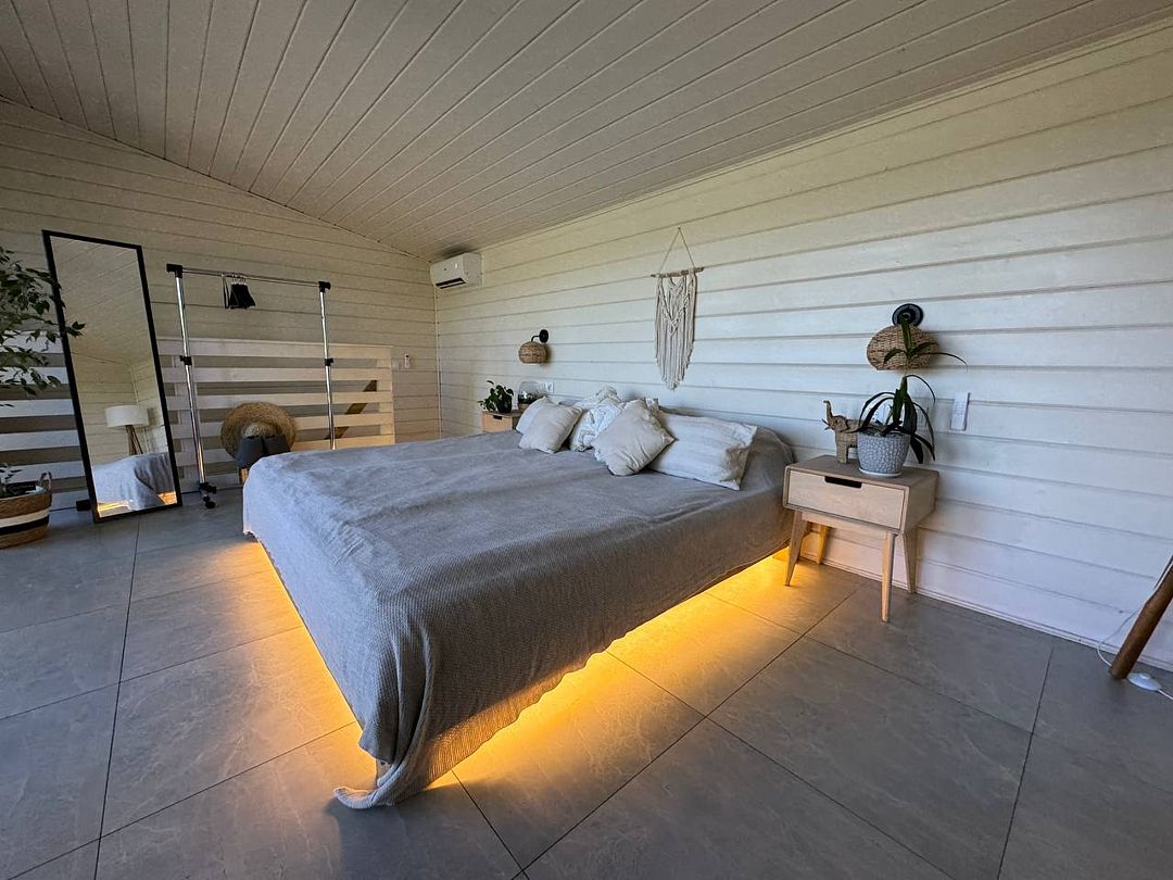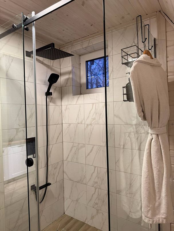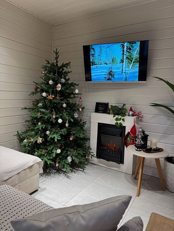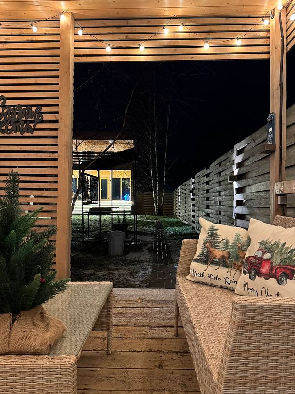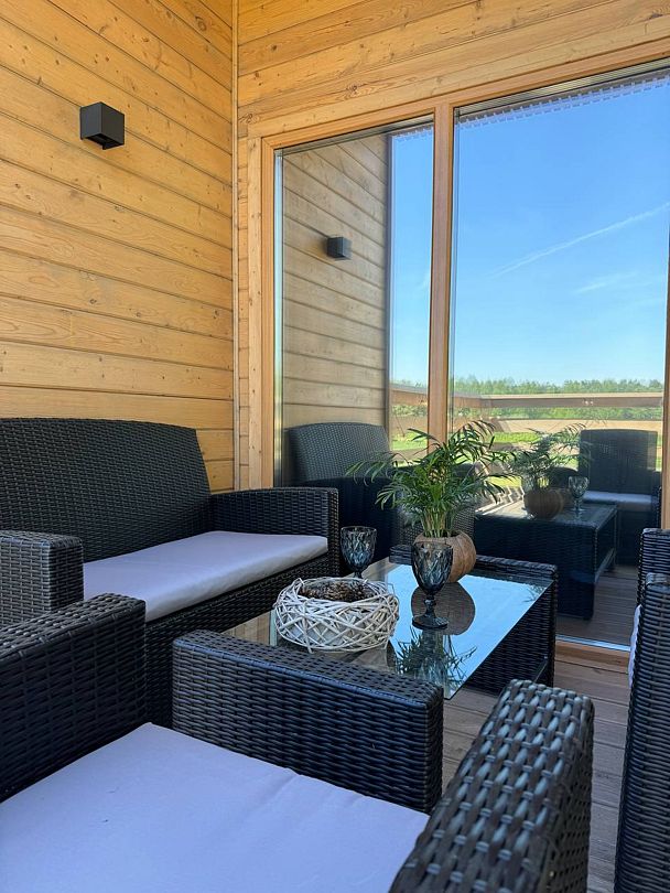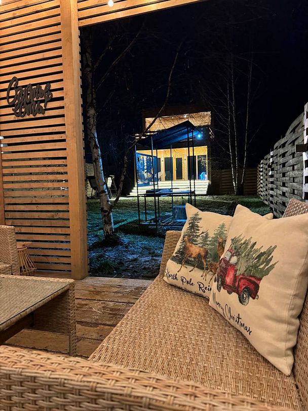 В доме большая спальня с подвесными креслом-гамаком и панорамным видом на реку, терраса с садовой мебелью, гостиная с электрическим камином, полностью оснащённая кухня, питьевая вода, телевизор (Smart TV), колонка с Алисой, настольные игры, Wi-Fi. В доме 4 спальных места (на втором этаже двуспальная кровать Double king size 2х2м, на первом этаже раскладной двуспальный диван), комфортный санузел внутри дома.