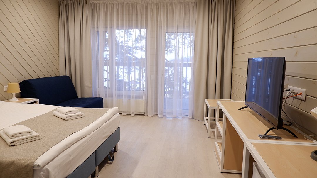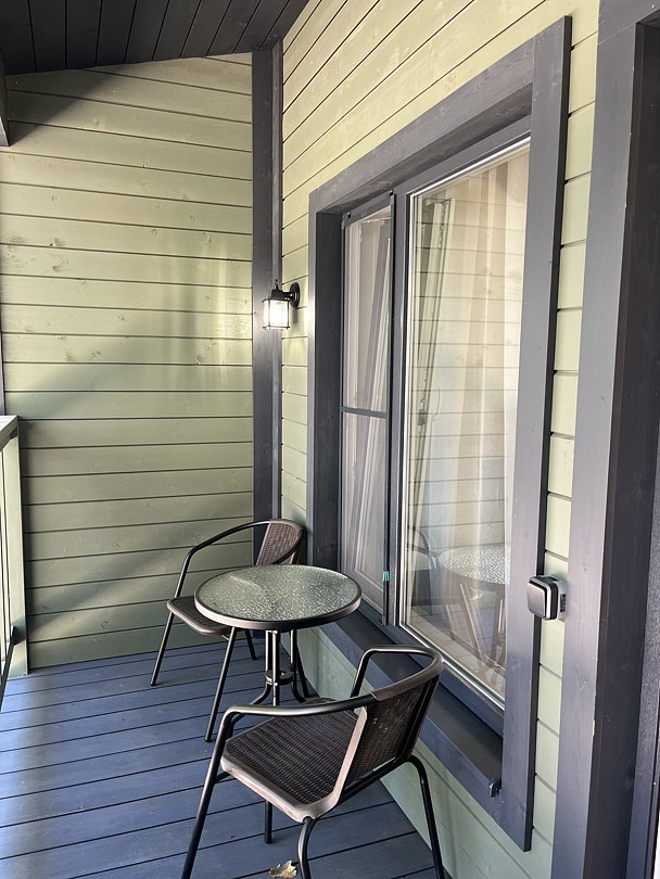 Номер расположен на втором этаже деревянного коттеджа с внешней металлической лестницей. Вид на озеро. Сауна входит в стоимость номера.