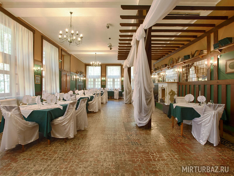 Питание гостей круглогодично осуществляется в ресторане «Пушкин», предлагающем русскую и европейскую кухни. Оборудованы летние площадки для проведения торжеств и иных мероприятий. На пляже работает летнее кафе с панорамным видом на озеро.