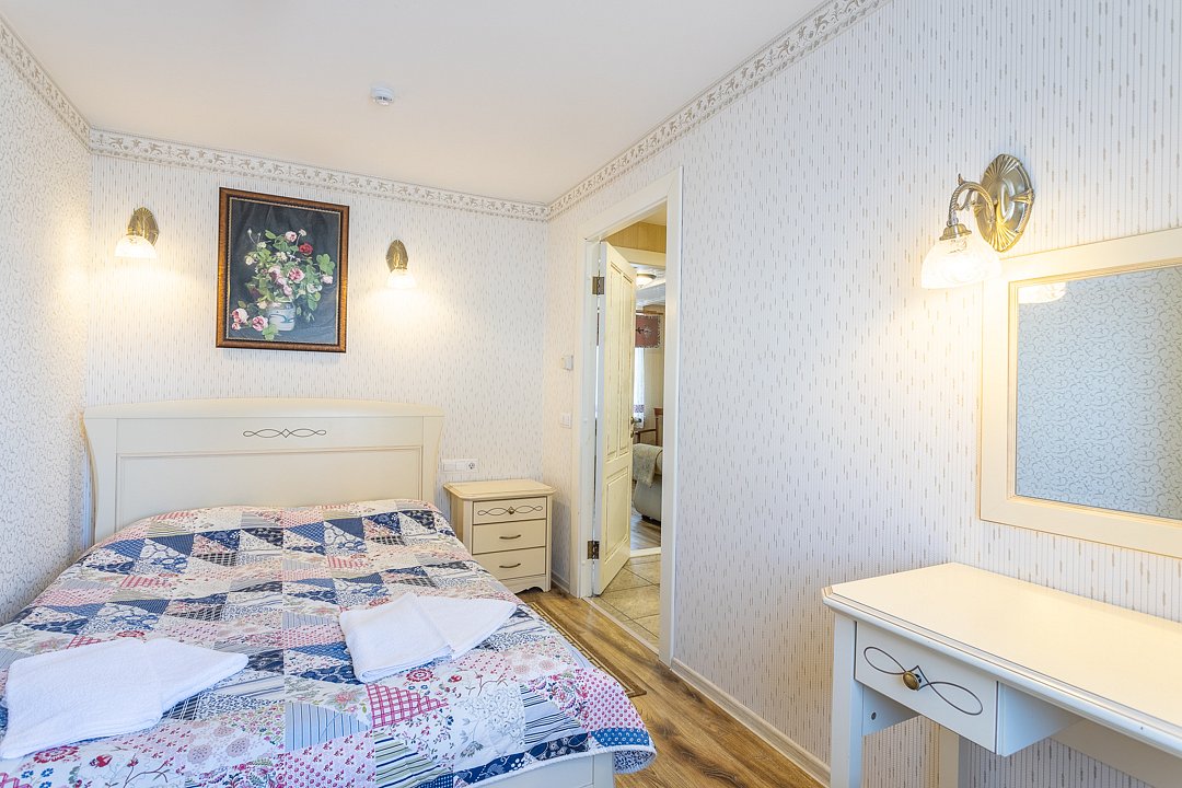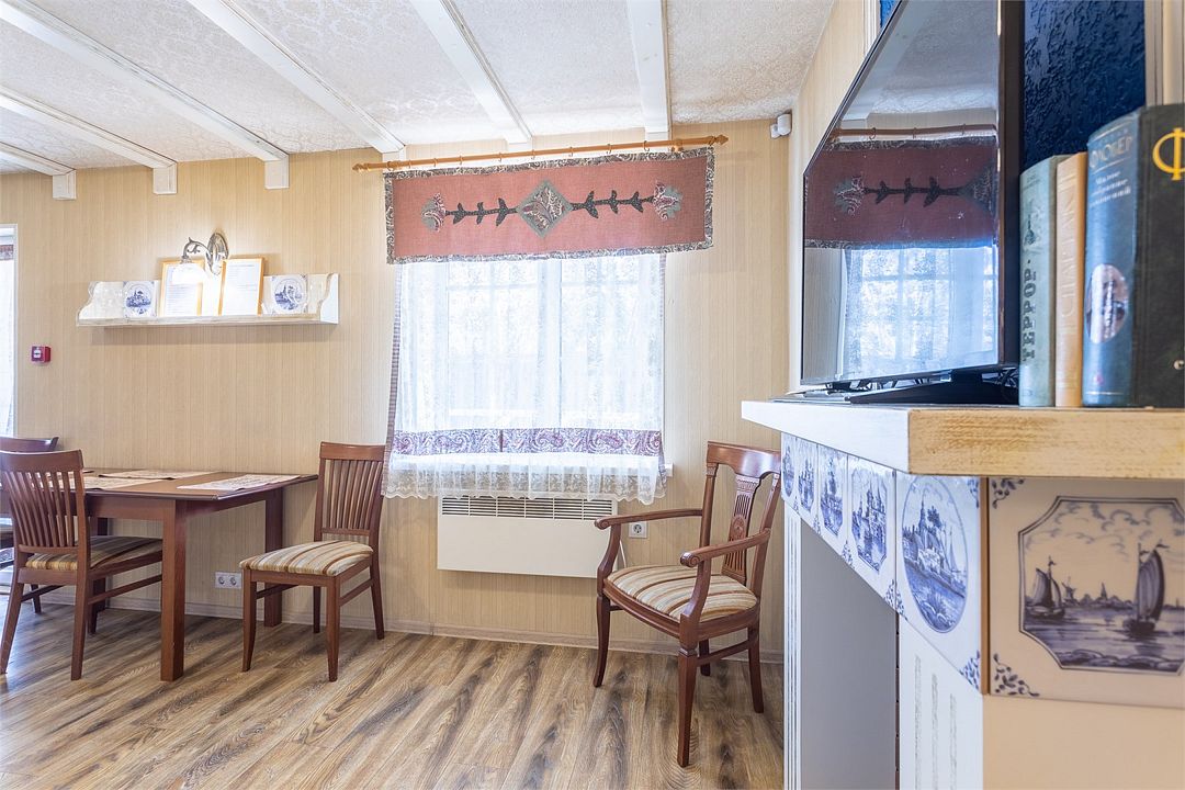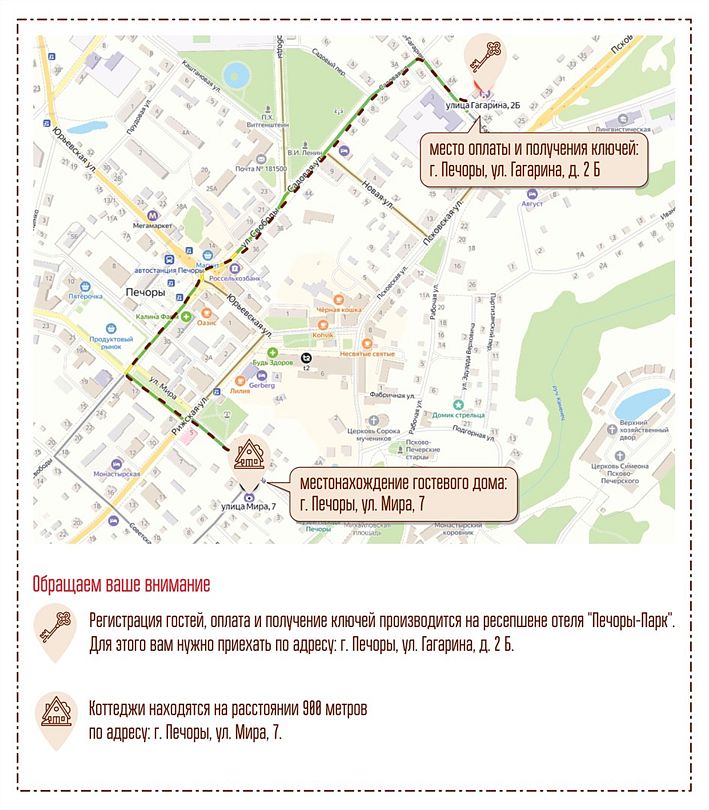 Каждый дом оснащен тремя спальнями, гостиной, кухней, террасой и балконом, сидя на которых можно любоваться прекрасным видом Печорской обители. Также в домах предусмотрены кухонные уголки с плиткой, холодильником, необходимым набором посуды и электрочайником. В коттеджах установлены телевизоры с множеством каналов, свободный wi-fi, душевые и туалеты. Для полноценного отдыха предусмотрен мангал, охраняемая стоянка на несколько автомобилей, огороженная территория. Каждый домик может вместить в себя до 7 человек. Обращаем ваше внимание, что регистрация гостей, оплата и получение ключей производится на ресепшене отеля "Печоры-Парк". Для этого вам нужно приехать по адресу: г. Печоры, ул. Гагарина, д. 2 Б. Сами коттеджи находятся на расстоянии 900 метров по адресу: ул. Мира, 7.Услуги и удобства