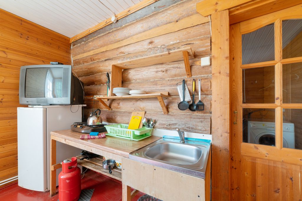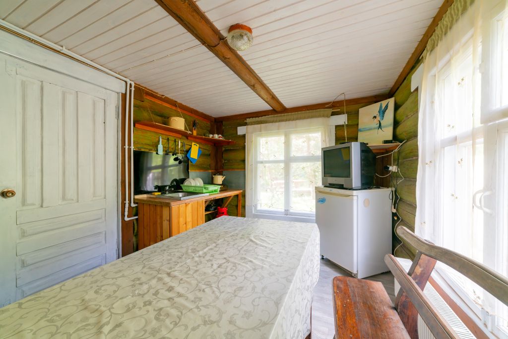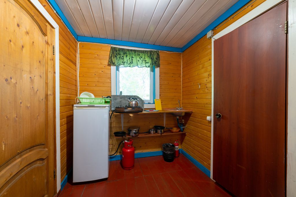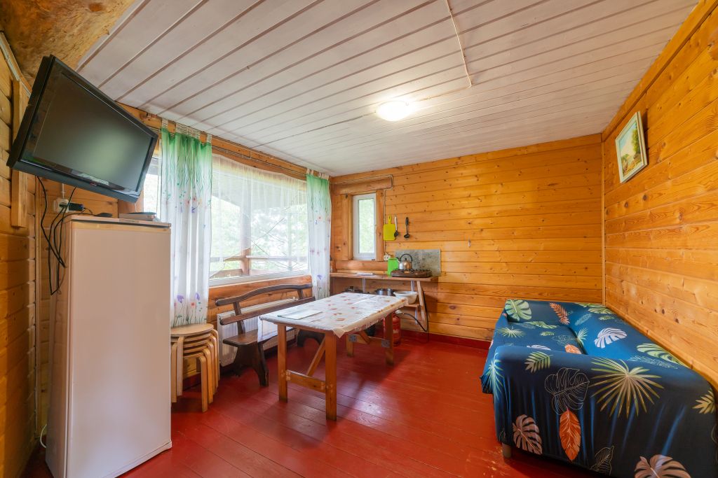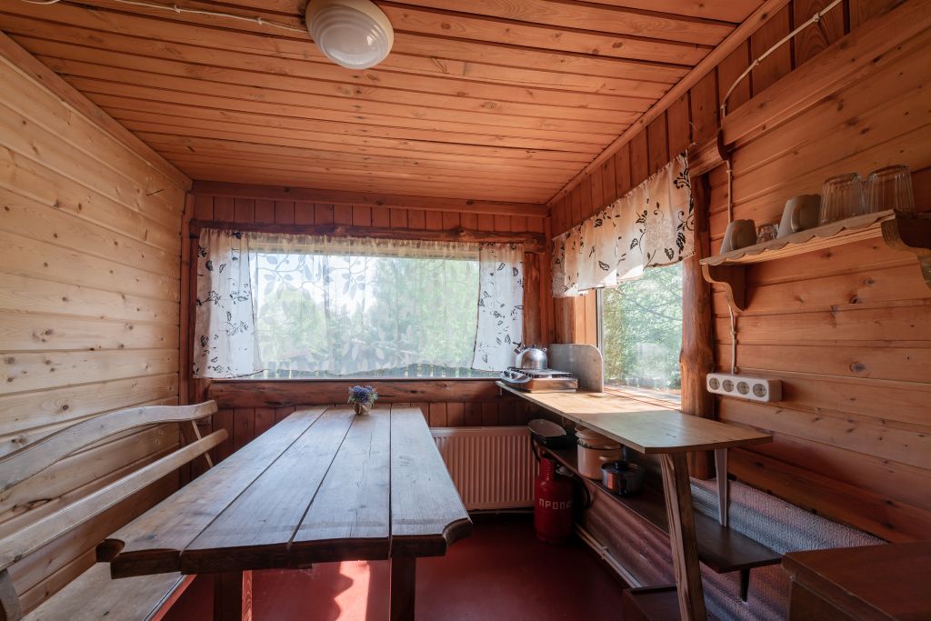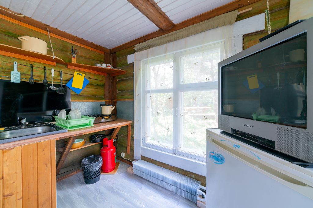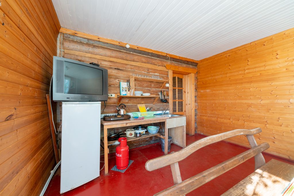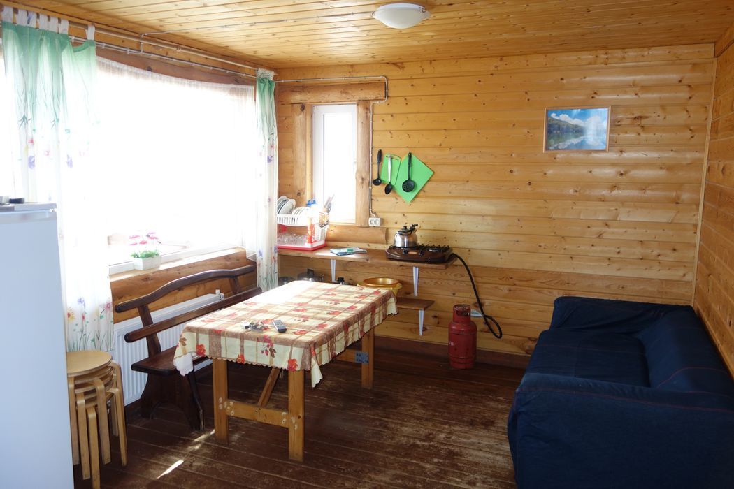- Мини кухня оборудованная с набором посуды, холодильник, газовая плитка, деревянный стол со скамьями.