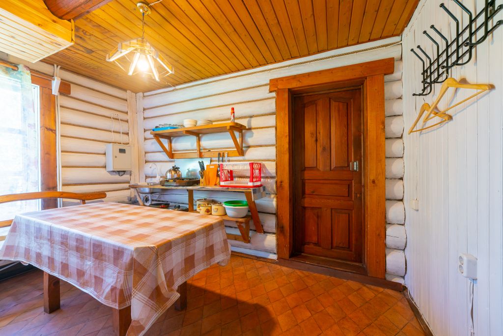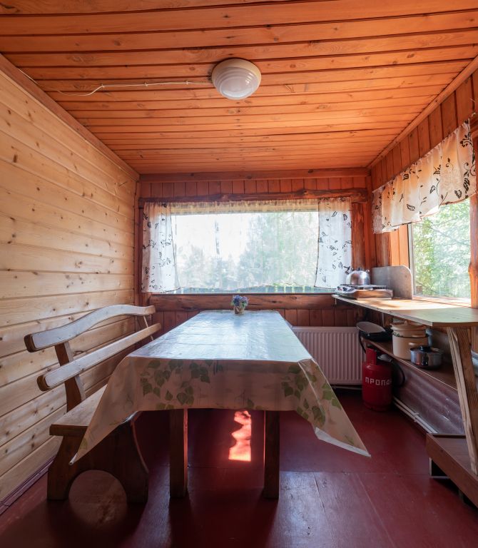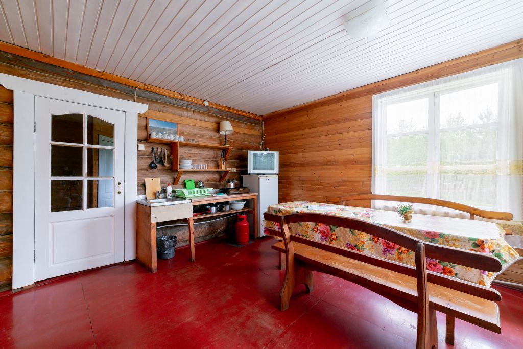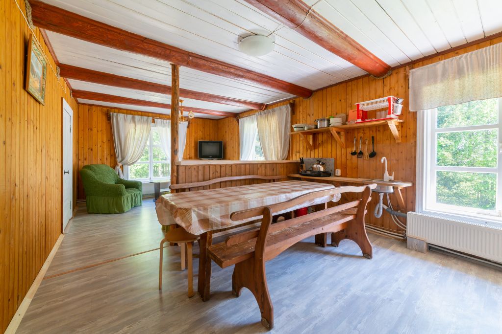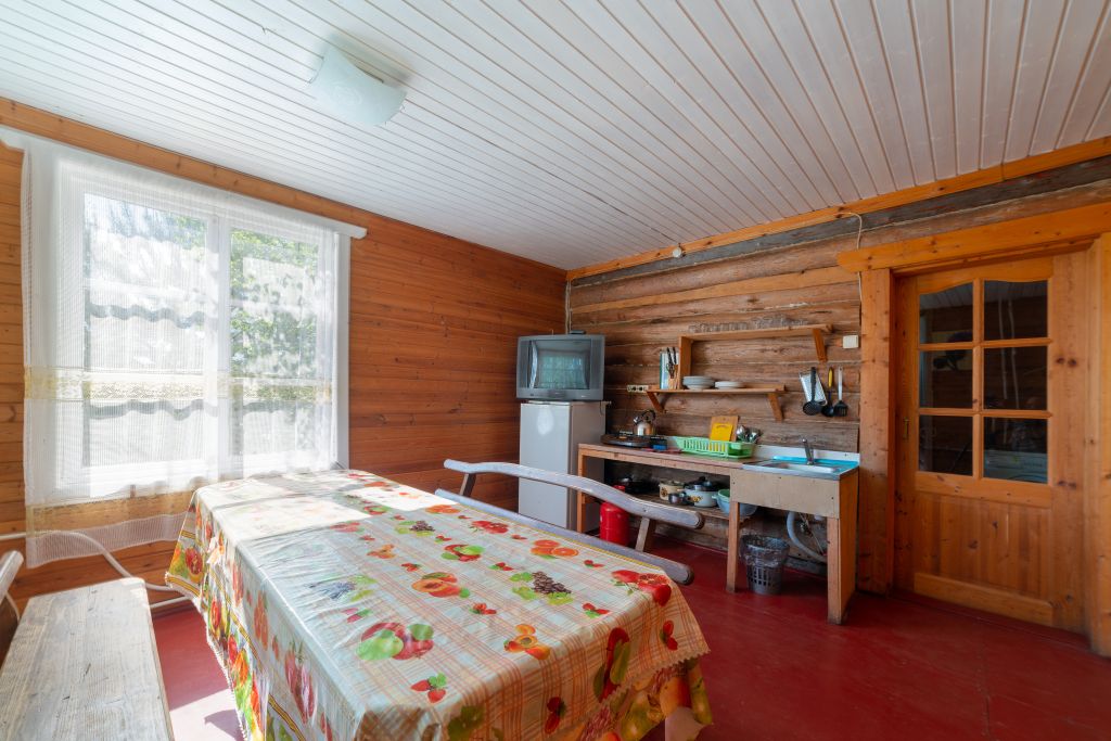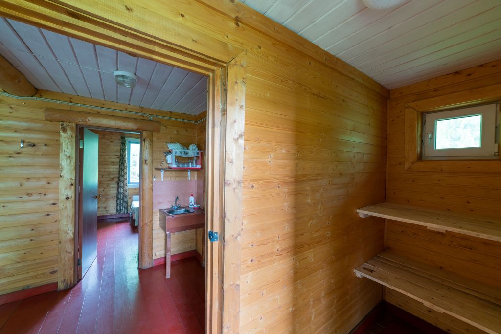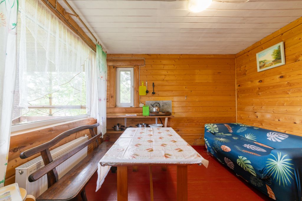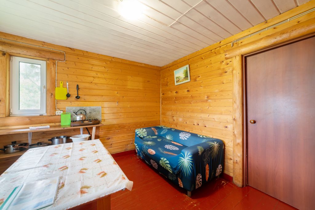 - Мини кухня оборудованная с набором посуды, холодильник, газовая плитка, деревянный стол со скамьями.