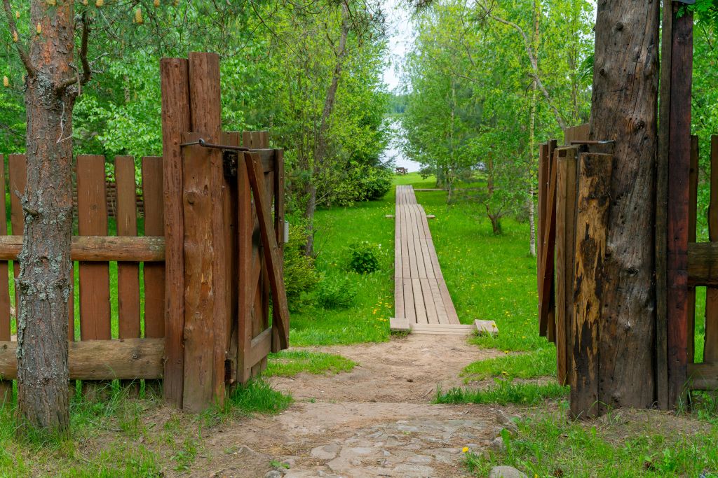 Вокруг домика расположен помост со ступеньками, спускающимися к воде. К домику с помостом ведет деревянный мостик.