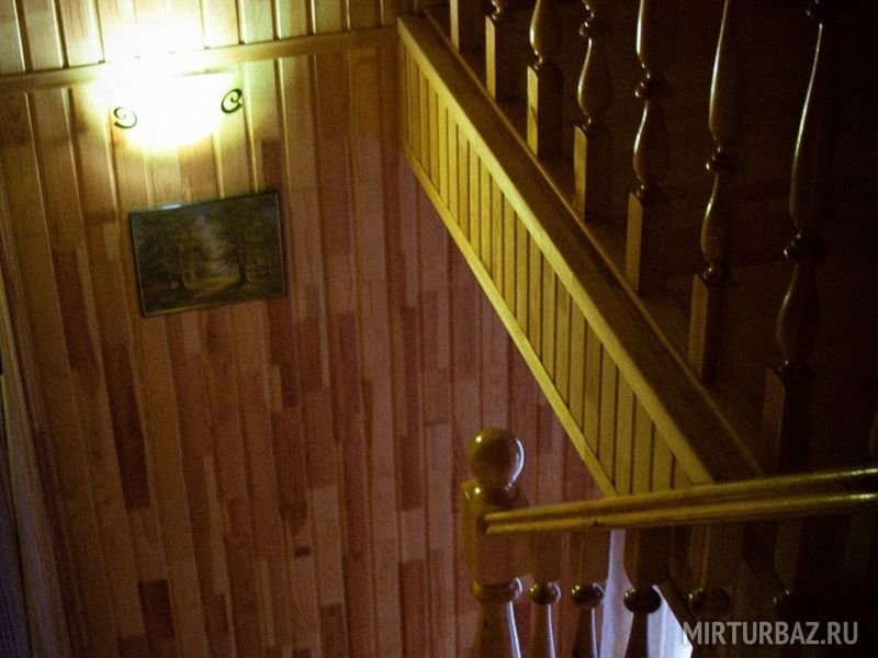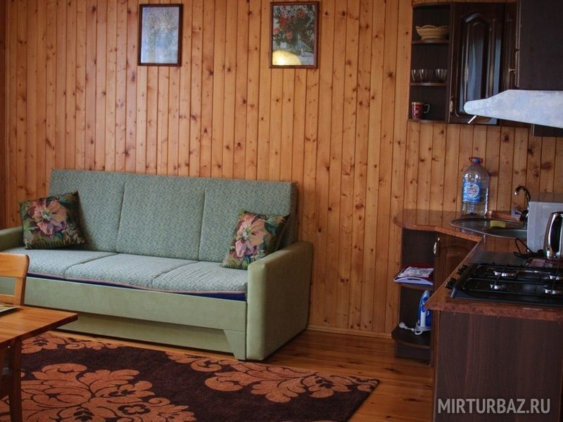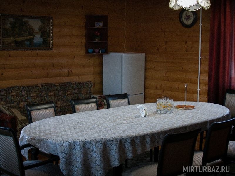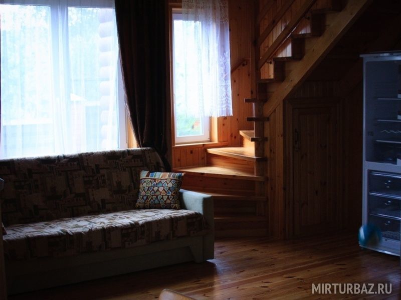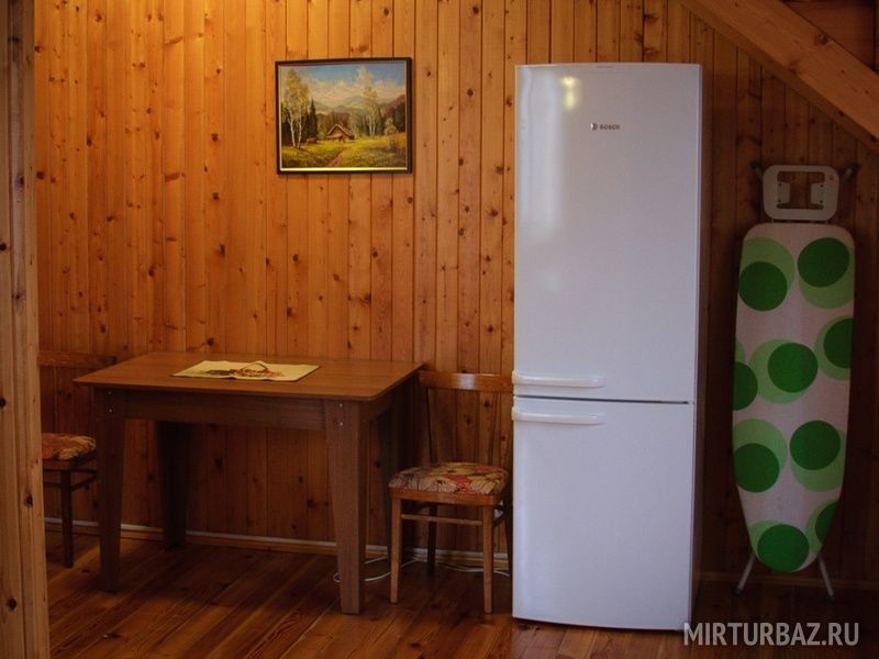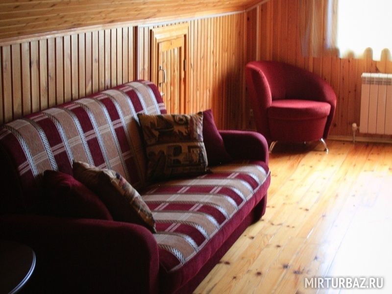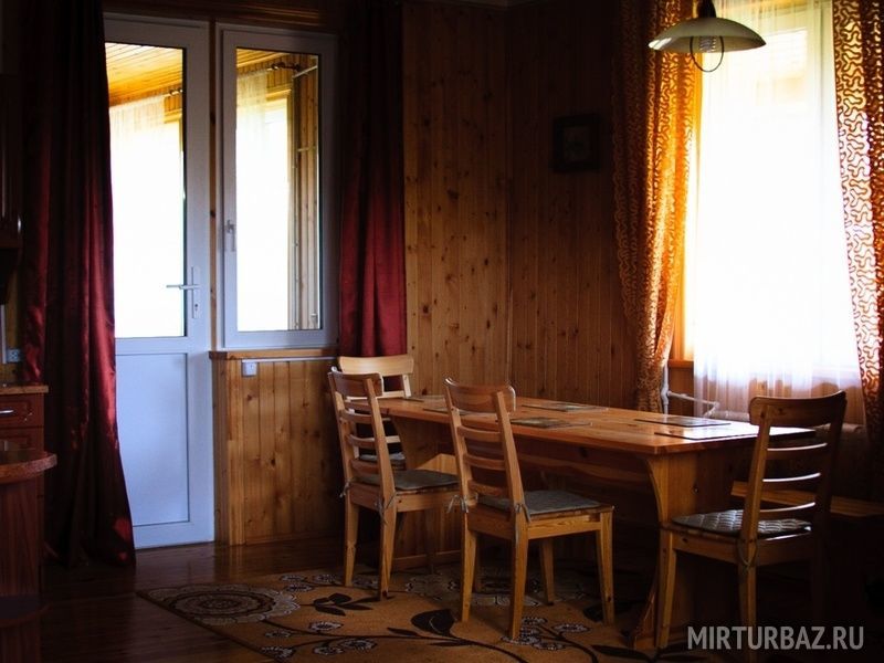Большой удобный коттедж, разделенный на три части (по 5 человек) с отдельными входами. В каждой части на 1 этаже находится оборудованная кухня с плитой, СВЧ-печью и холодильником, обеденная зона со столом и гостиная, на 2 этаже – спальная комната.