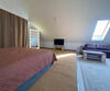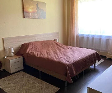 Номер студия с двуспальной кроватью плюс диван. В номере телевизор, чайник, сан узел , холодильник.