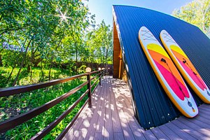 Уникальный коттедж треугольником в стиле А-фрейм — идеальное место для романтических вечеров или дружеских посиделок небольшой компанией. Можно погреться в банном чане или попариться в финской сауне, а летом поплавать на сапбордах или катамаранах.
