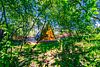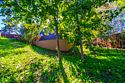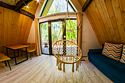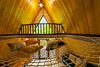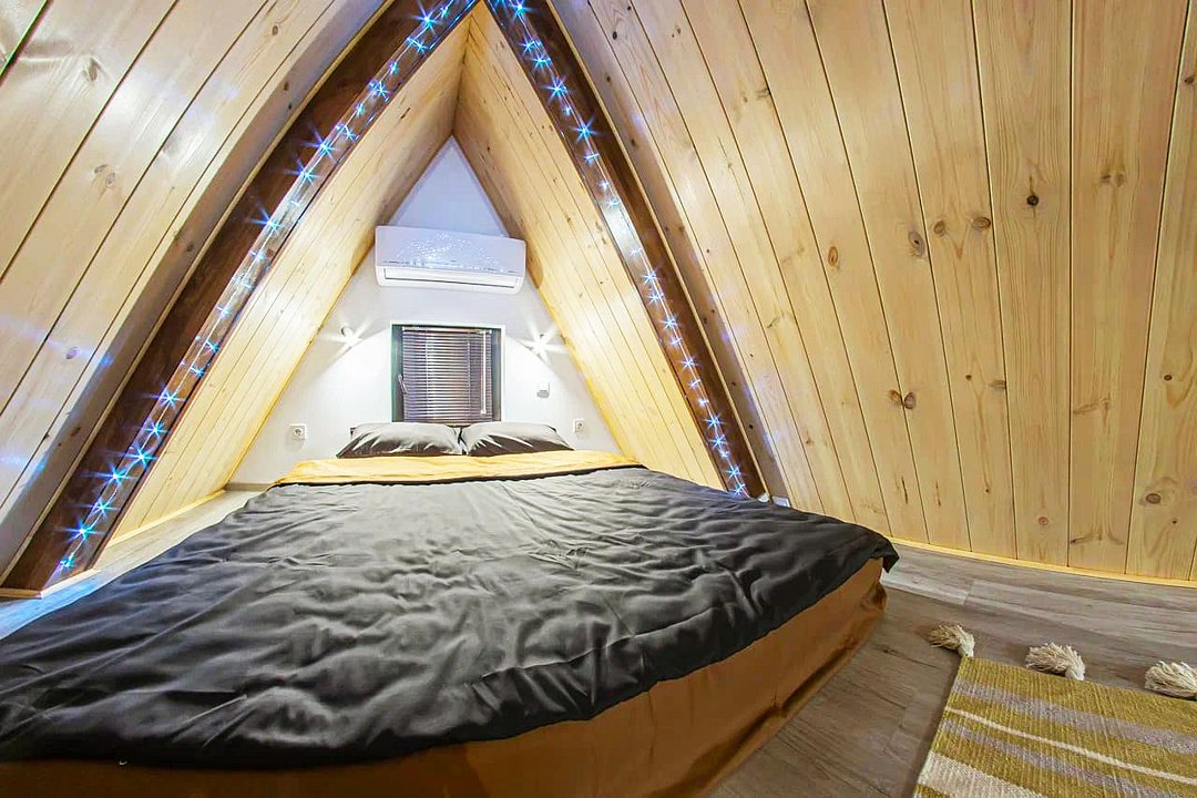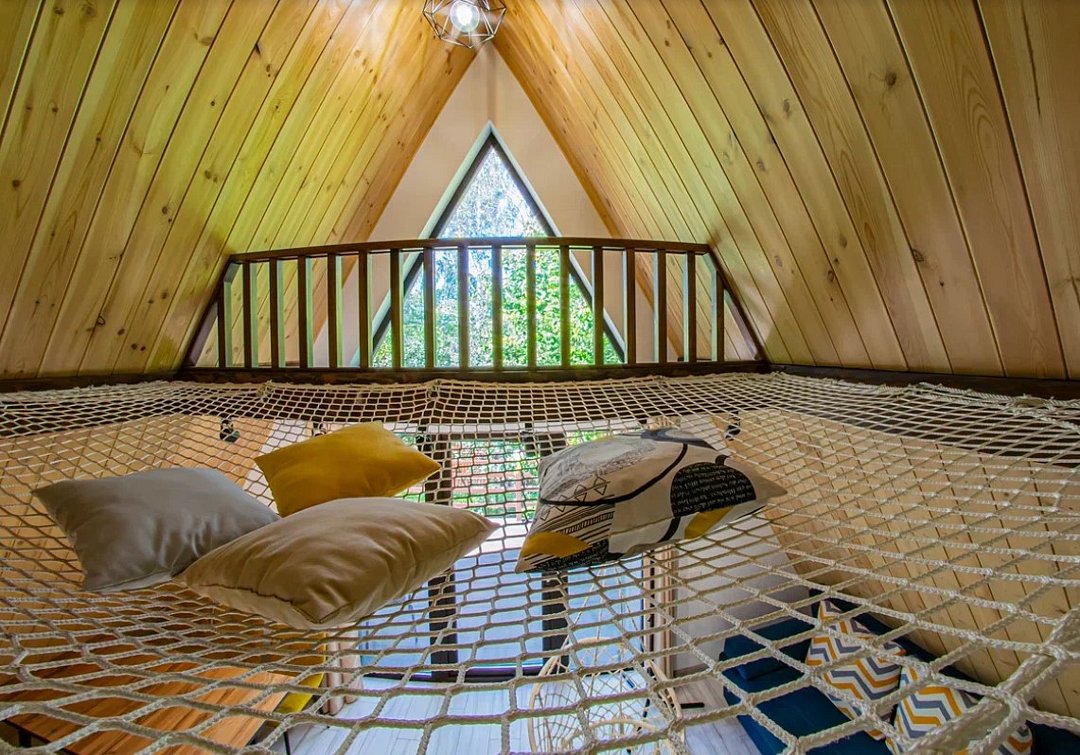 В домике А-фрейм есть уютная сетка кровать. В ней можно лениво валяться и отдыхать, а если посмотреть вниз — даже испытать острые ощущения, ведь она на втором этаже!